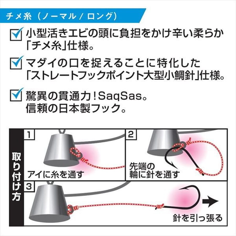 リアクション釣法対応やわらかチメ糸仕様。チメ糸・・・小型活きエビの頭に負担をかけ辛い柔らか「チメ糸」仕様。マダイの口を捉えることに特化した「ストレートフックポイント大型小鯛針」仕様。驚異の貫通力サクサスフック。