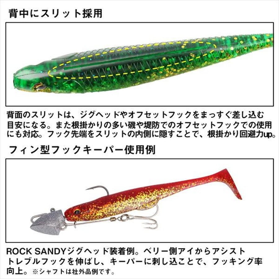 好みのジグヘッド、リグに組み合わせ可能なスタンダード・シャッドテールワーム目玉付きのリアルな外観はそのままに、多様化が進むリグへの対応力を強化。さらに、貴重なバイト時にボディが折れ曲がりやすいソフトマテリアルを採用し、スムーズなフッキングを実現した。ハイプレッシャー化が進むフィールドでも通用する実釣性能を高めた、現代のスタンダード・シャッドテールワームである。