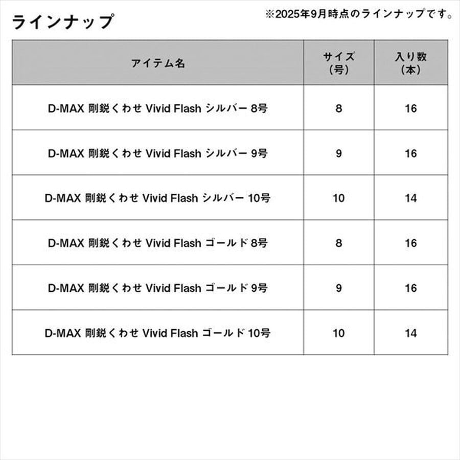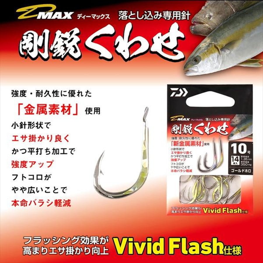 DAIWA落とし込みシリーズで使用の独自落とし込み専用針のバラ売り版(Vivid Flash)が遂に登場。DAIWA落とし込みシリーズで使用している針の中で剛鋭イサキ、剛鋭くわせの2種に独自針がある。自作の方や、カスタム用にバラ針小袋としてリリース。当然、針の胴打ち部分にはVivid Flash(ホロシール直貼り)仕様で、エサ掛かりが向上する仕様に仕上げている。ホロシールはシルバー、ゴールドの2パターンシルバーは定番かつ、特にイワシベイト時に有効。ゴールドも定番だが、特にアジベイト時に有効。