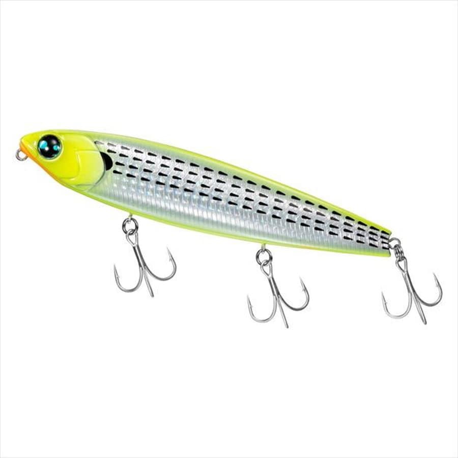 小沼正弥監修。トリッキートップペンシル「トリックアッパー」が高音響ラトルサウンドタイプとなって新登場。強烈な「水面を叩きつける音」に「重低音ラトルサウンド」をプラス!集魚性能UP+シーバスの捕食スイッチを入れる。(ボーン素材ボディ+大径ラトルウエイト+カップマウス)×立ち姿勢により、激しいサウンドとスプラッシュを発生。マウスカップが生む泡の軌跡が魚を寄せる!!連続トゥイッチでイレギュラー&ダイブ、トリッキーアクションが混ざったドッグウオーク=パニックアクションが簡単に発生する。移動幅が大きすぎないドッグウォークアクションを設定。リア重心で安定した飛行距離。130Fは立ち姿勢を水平気味にし、ドッグウォークアクションのしやすさを追求した。