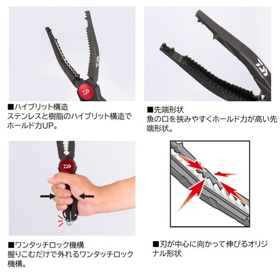 大型のアジやサバ・タチウオ等をガッチリ掴めるホールド幅約130mm ステンレス刃のハイブリット構造で更にホールド力UP!ステンレスと樹脂のハイブリット構造でホールド力を強化したHDモデルのフィッシュホルダー。グリップ力にこだわったオリジナル刃形状。中心に刃を向けて配置することによって魚をガッチリホールド可能。魚の口を挟みやすい先端形状。握りやすく力を入れやすいオリジナルグリップ。握りこむだけで外れるワンタッチロック機構。尻手ロープ取り付け穴付き。