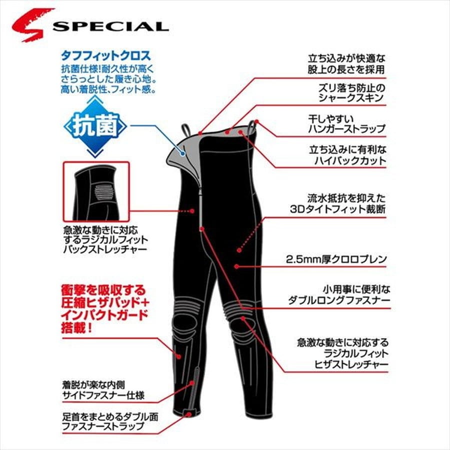 鮎師の求める全てを詰め込んだ鮎釣り専用スペシャルタイツ。鮎釣りの立ち込みや激しい動きに対応する、日本製の高機能スペシャルタイツ。万一の転倒時にも安心の衝撃吸収材「インパクトガード」をヒザ・スネに内蔵し、釣りの安全性を向上。快適性と操作性も徹底追求。足首内側のサイドファスナーで着座姿勢でもシューズやタビの脱ぎ履きがスムーズ。さらに、小用時に便利なダブルロングファスナーや、足首をまとめるダブル面ファスナーストラップを装備。機動性と保温性を両立した2.5mm厚クロロプレン素材に、急な動きにも追従するラジカルフィットバックストレッチャー/ラジカルフィットヒザストレッチャーを搭載。流水抵抗を抑えた3Dタイトフィット裁断で、立ち込み釣りも軽快に。ハイバックカットで立ち込み時の安定性を確保し、ズリ落ち防止のシャークスキンで安心感をプラス。使用後の干しや収納も便利なハンガーストラップ付き。鮎釣りに最適化された、日本製プレミアムタイツで、釣りをより快適に、安全に楽しめる。