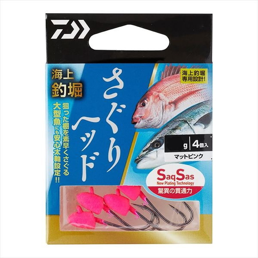 狙った棚を素早くさぐる!大型魚にも安心の太軸設計!海上釣堀専用設計のジグヘッドが登場!イケスの中でステイした際に喰わせとフッキングのバランスを考えた設計となっている。針は「驚異の貫通力」サクサスフックを使用しており、真鯛・青物のパワーにも負けない太軸設計の針を採用した。ヘッドのカラーは発色の良いカラーを採用し、魚へのアピール力の高さと視認性の良さを兼ね備える。