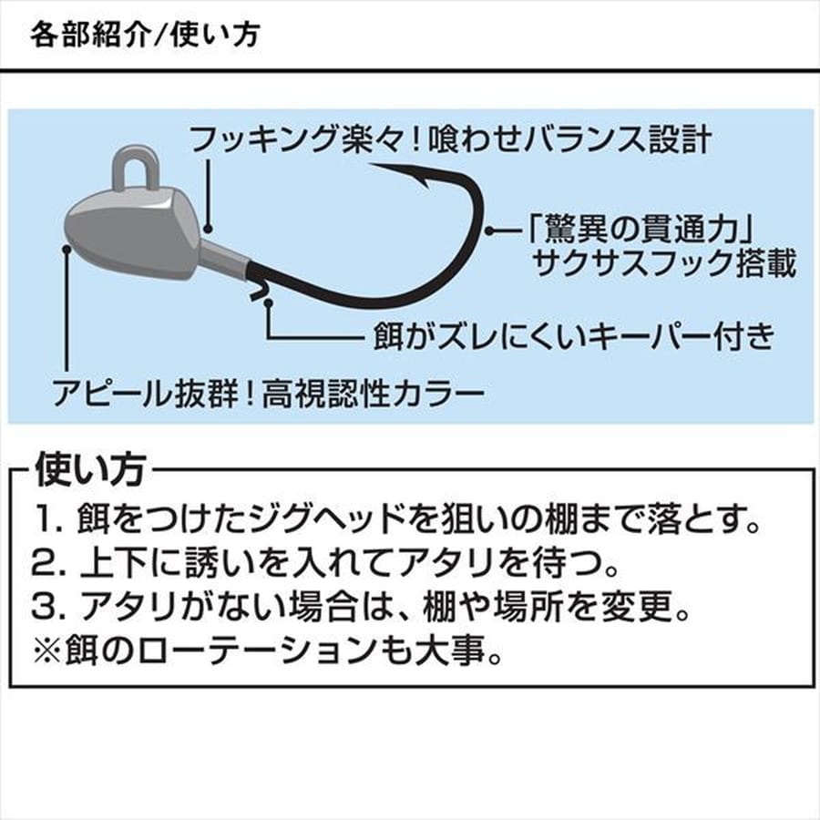 狙った棚を素早くさぐる!大型魚にも安心の太軸設計!海上釣堀専用設計のジグヘッドが登場!イケスの中でステイした際に喰わせとフッキングのバランスを考えた設計となっている。針は「驚異の貫通力」サクサスフックを使用しており、真鯛・青物のパワーにも負けない太軸設計の針を採用した。ヘッドのカラーは発色の良いカラーを採用し、魚へのアピール力の高さと視認性の良さを兼ね備える。