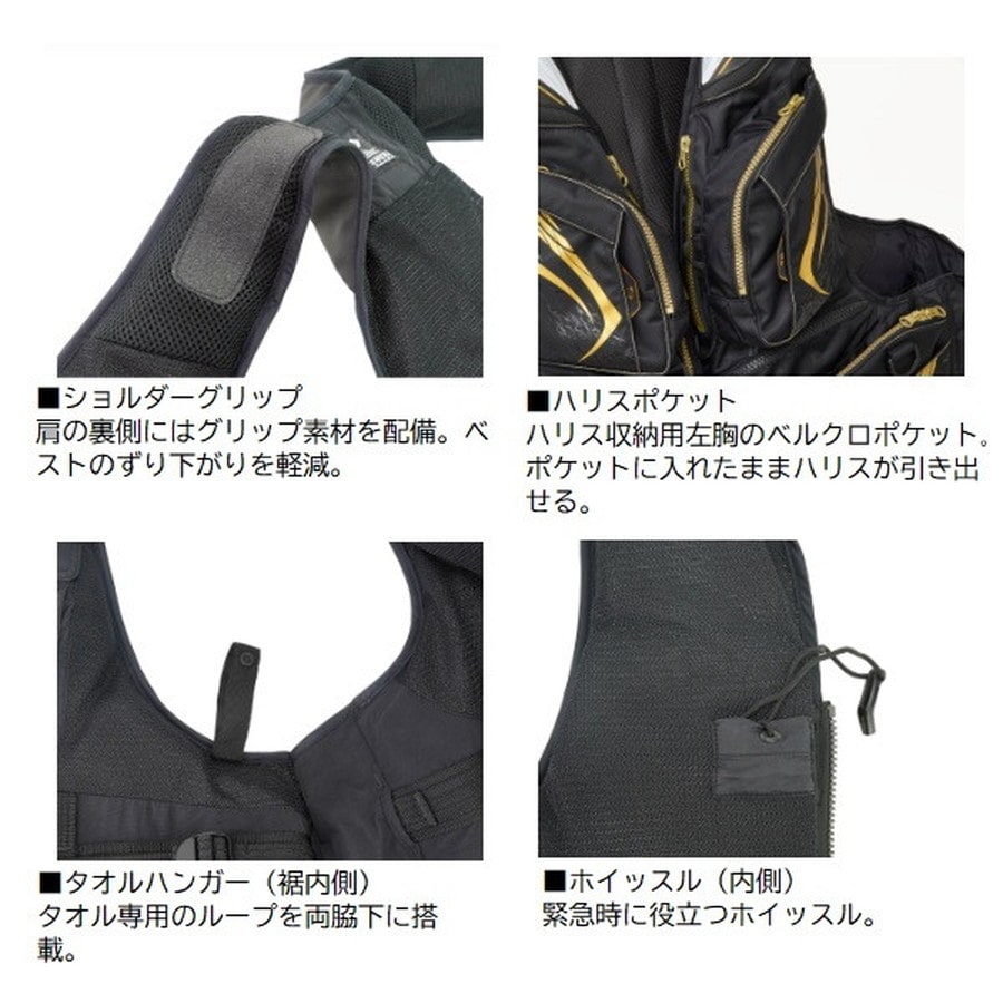 安全性も、機動性も、快適性もすべてを一着に。磯ベストのフラッグシップモデル。 CSマーク 性能鑑定適合品(L2)。■浮力材設計を刷新。腰回しりのFT感が向上。ロッド操作の操作性を考慮し肩甲骨の可動域を妨げない背面カッティング。取り外し式のサーモハッチバック機能。■海水や潮風からくる錆びを予防するため、ピンオンリールをポケットの中に入れたまま取り付けパーツ先を出すことが可能な出し口を胸ポケット底に配備。■中間ポケットを使いやすく進化。開口部にカーブ形状を採用し、着用時でも視認性・出し入れのしやすさが向上。■股ベルトをより着けやすく。前部の取付位置を身体中心側に移動。着脱がスムーズに。■背面の刺繍にも配慮した意匠設計。取り外し式サーモハッチバックに加え、背面グラフィックは中央を避けたレイアウトで刺繍加工がしやすい仕様に。