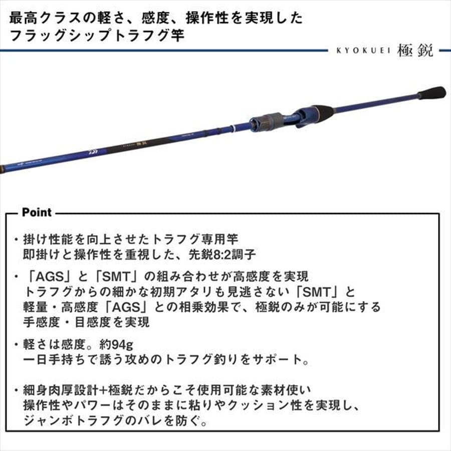 最高クラスの軽さ、感度、操作性を実現したフラッグシップトラフグ竿。穂先には、トラフグ釣り専用チューニングを施した、しなやかな「SMT」を搭載。違和感なく食わせる食い込み性能と、細かいアタリを手感度・目感度で感じ取れる高感度を実現。更に軽量・高感度「AGS」との相乗効果で、極鋭のみが可能にする手感度と操作性を付与。リールシートには軽量でフィット感に優れたゼロシートキャビティトリガーを搭載することで、軽さに磨きをかけた。また、穂持に適度なパワーを持たせ、ブランクを細身肉厚に設計することで、即掛けを可能にしながらも、粘りとクッション性に優れ、ジャンボトラフグのバレを防ぐ。食わせと掛け、双方を高次元で両立する、トラフグ釣りの最先端を体現する専用竿。8:2調子 バットジョイント2ピース。
