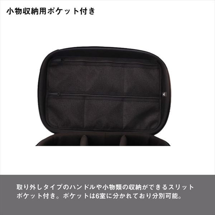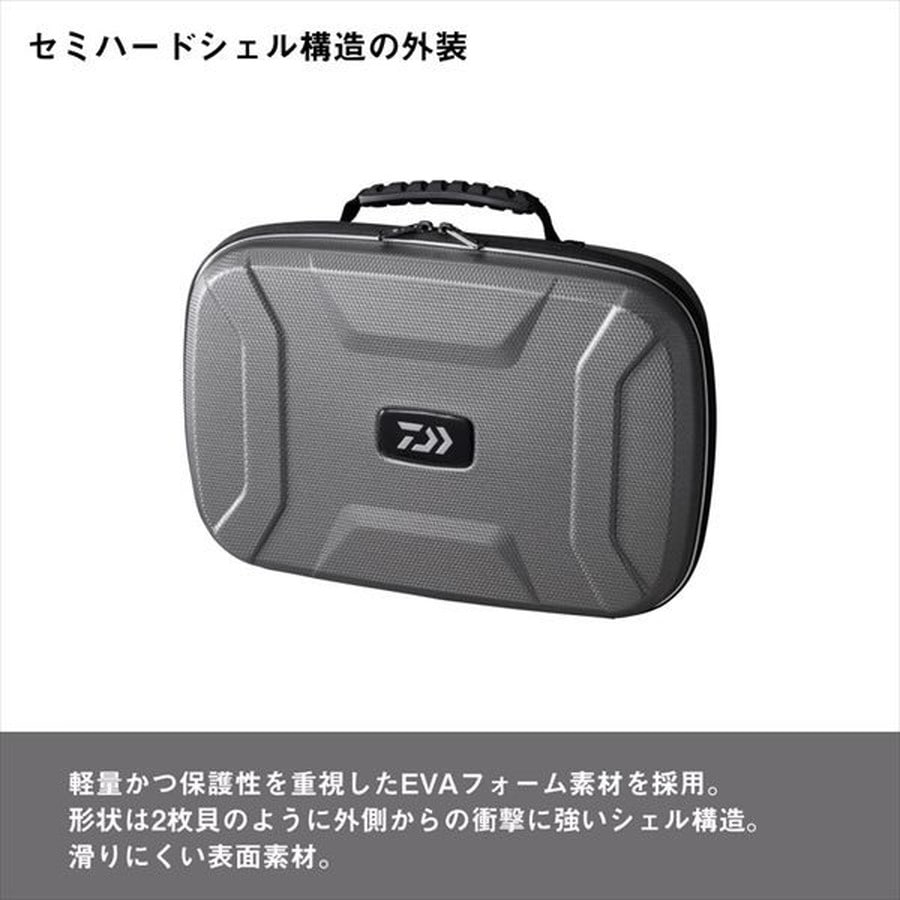 衝撃に強いセミハードシェル構造のリールケース!本体部は外側からの衝撃をやわらげるEVAフォーム素材採用。本体内部はリールの傷つきを抑える厚肉クッション材仕様。収納部分を調整できるフリーパーテーション。リールハンドルや小物の収納が可能なポケット付き(6室)。