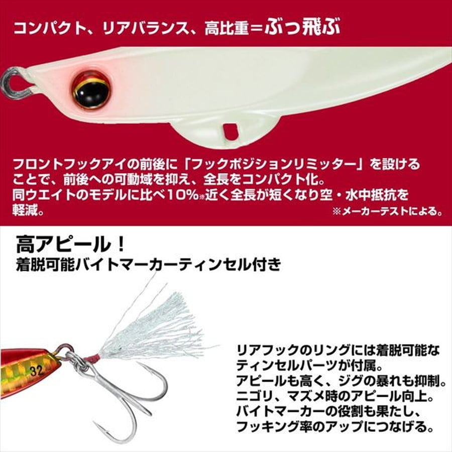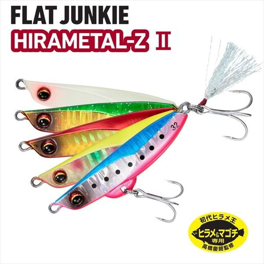 ヒラメ、マゴチ専用の悶絶アクション2フックメタルジグ「ヒラメタルZ」が、「ZII」の名を冠してブラッシュアップ!ヒラメ狙いのアングラーに贈るヒラメ&マゴチにターゲットを特化したフラットジャンキーシリーズ。プラグ、ワームでは攻めきれない「遠距離&ディープ」に潜むターゲットを狙うときに有効なサーフゲームの標準ウエイトモデル。ボディ延長&フックポジションリミッター改善により、1サイズ大型のフックが搭載可能に(フロント#6:リア#4)。これにより、波打ち際での攻防の際、座布団ヒラメなどの大型魚が引き波に持っていかれるときに発生する強い負荷で多発していたフック伸びによるバラしが激減。濁りに強い多面・高フラッシングデザインで広範囲にアピール。着脱可能バイトマーカーティンセルがリアクションバイトを誘発。