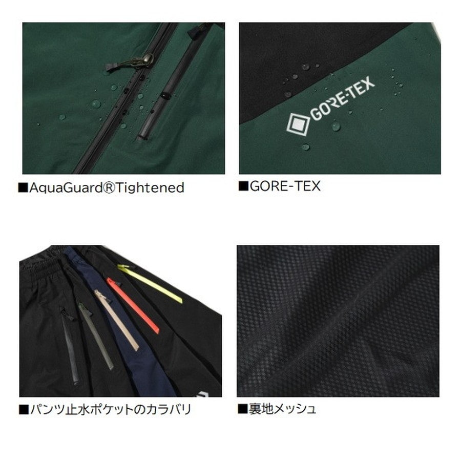 定番GORE-TEXレインスーツに耐水性を高める「AquaGuard Tightened」を採用。優れた防水性、防風性、透湿性を有する2層構造のGORE-TEX生地を採用することで、柔らかくしなやかな着心地。フロントファスナーには、YKKとの開発で実現したAquaGuard Tightenedを搭載。従来の止水ファスナーより耐水性が大幅に向上。軽量化するとともにファスナーの生地噛みがなくなり、スムーズな開閉が可能。表地は環境配慮されたGORE-TEX ePE膜となり、前モデルより軽量で丈夫なレインウエアへ。環境負荷の少ないフッ素フリー撥水剤を使用したモデル。裏地にメッシュを配した二重構造とすることで、肌離れがよく、雨を肌で感じにくくなり、肌寒い時にも快適に着用可能。ポケットには止水ファスナーを採用し、防水性を重視。袖口から水の浸入を軽減する二重袖口採用。パンツポケットにも止水ファスナーを採用。裾にはベルクロを配し、絞り込むことが可能。