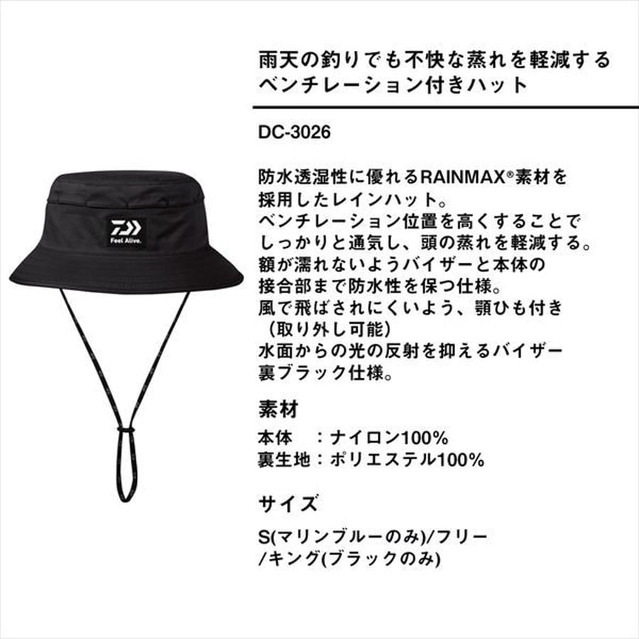 雨天の釣りでも不快な蒸れを軽減するベンチレーション付きハット。防水透湿性に優れるRAINMAX素材を採用したレインハット。ベンチレーション位置を高くすることでしっかりと通気し、頭の蒸れを軽減する。額が濡れないようバイザーと本体の接合部まで防水性を保つ仕様。風で飛ばされにくいよう、顎ひも付き(取り外し可能)。水面からの光の反射を抑えるバイザー裏ブラック仕様。