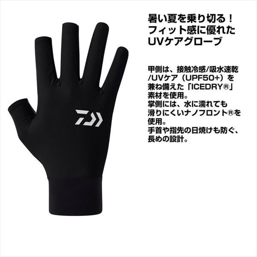暑い夏を乗り切る!フィット感に優れたUVケアグローブ。甲側は、接触冷感/吸水速乾/UVケア(UPF50+)を兼ね備えた「ICEDRY」素材を使用。掌側には、水に濡れても滑りにくいナノフロントを使用。手首や指先の日焼けも防ぐ、長めの設計。