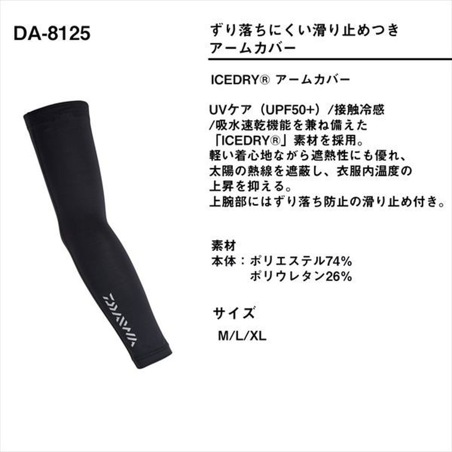ずり落ちにくい滑り止めつきアームカバー。UVケア(UPF50+)/接触冷感/吸水速乾機能を兼ね備えた「ICEDRY」素材を採用。軽い着心地ながら遮熱性にも優れ、太陽の熱線を遮蔽し、衣服内温度の上昇を抑える。上腕部にはずり落ち防止の滑り止め付き。