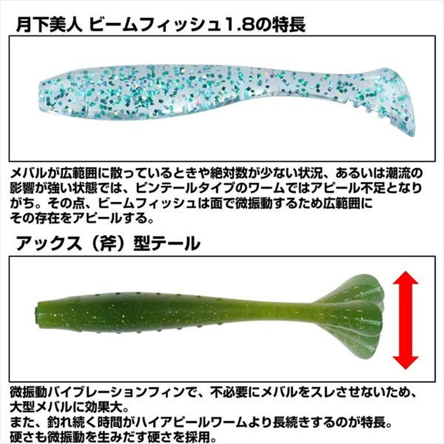 復刻要望が根強くあったビームフィッシュ1.8を復刻!メバルが広範囲に散っているときや絶対数が少ない状況、あるいは潮流の影響が強い状態では、ピンテールタイプのワームではアピール不足となりがち。その点、ビームフィッシュは面で微振動するため広範囲にその存在をアピールする。シャッドテールのようなワイドパタパタアクションとは違い、メバルがスレにくいのでバイトが長時間持続するのが特長。小魚の尾ビレを模した斧型のアックスフィンとリアルなシルエットはベイトフィッシュそのもの。フォール、ステイ、シェイクとどんな動きでも魚を怖がらせることなく、捕食モードのスイッチを入れられる。高強度素材の採用で耐久性に優れ、フグなどの猛攻に遭ってもちぎれ難い。アミノ酸系集魚エキスとソフトな食感との相乗効果でヒット&フッキングチャンスが拡大する。
