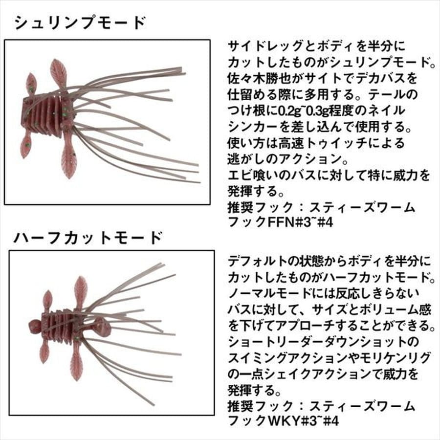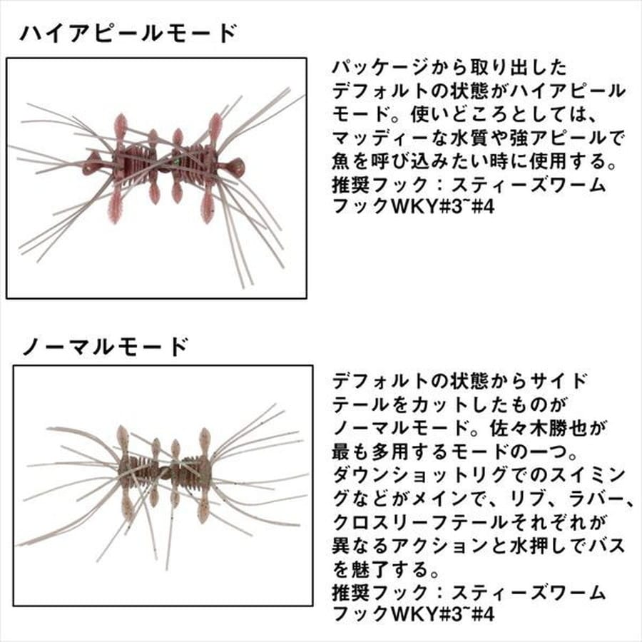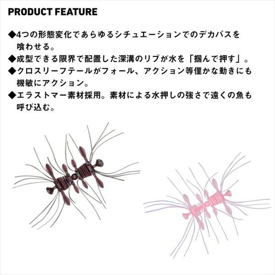 4つの形態変化でデカバスを騙しきる喰わせ特化のエラストマー製ワーム。4つの形態変化であらゆるシチュエーションでのデカバスを喰わせる。成型できる限界で配置した深溝のリブが水を「掴んで押す」。クロスリーフテールがフォール、アクション等僅かな動きにも機敏にアクション。エラストマー素材採用。素材による水押しの強さで遠くの魚も呼び込む。