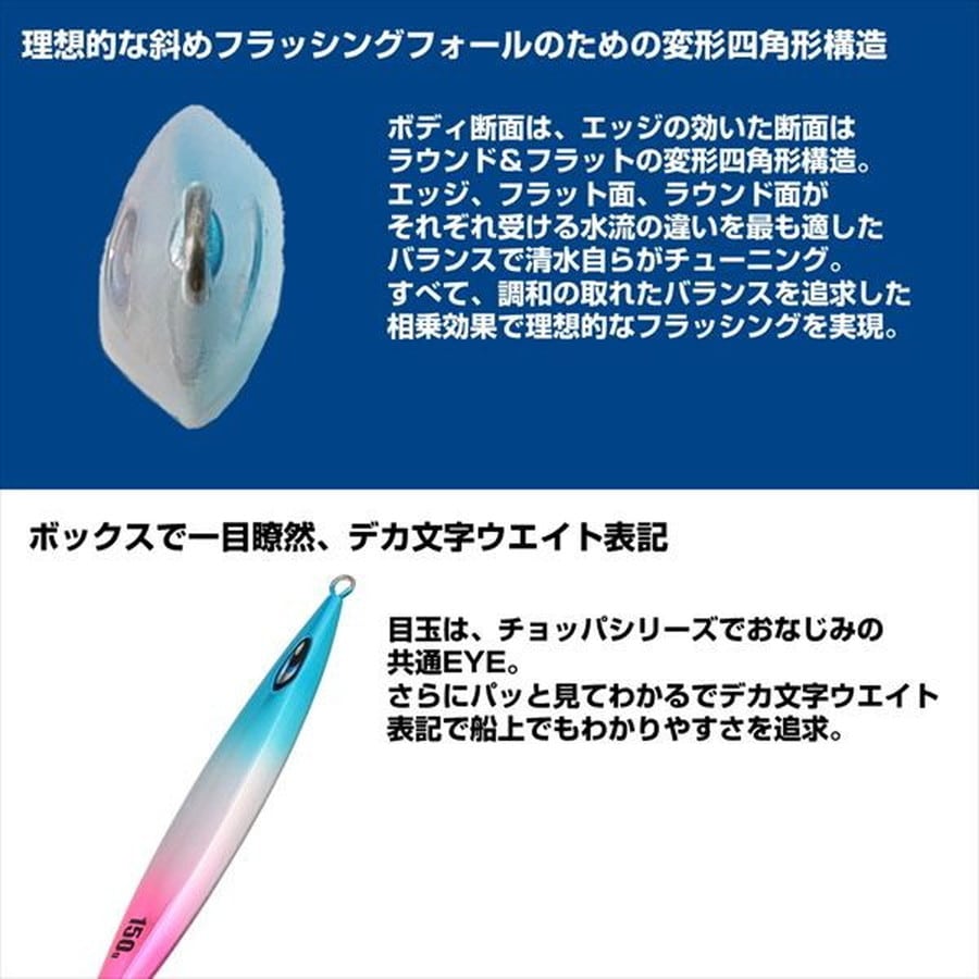 清水一成監修 73バランス、斜めフラッシングフォールジグ。フロント:リア=7:3のウエイトバランス&変則菱型断面構造のベイトジギング用メタルジグ。少量のラインスラックジャークでも機敏に呼応。斜めにフラッシングしながらフォールすることで、クレバーなターゲットを狂わせ、バイトに持ちこむ。