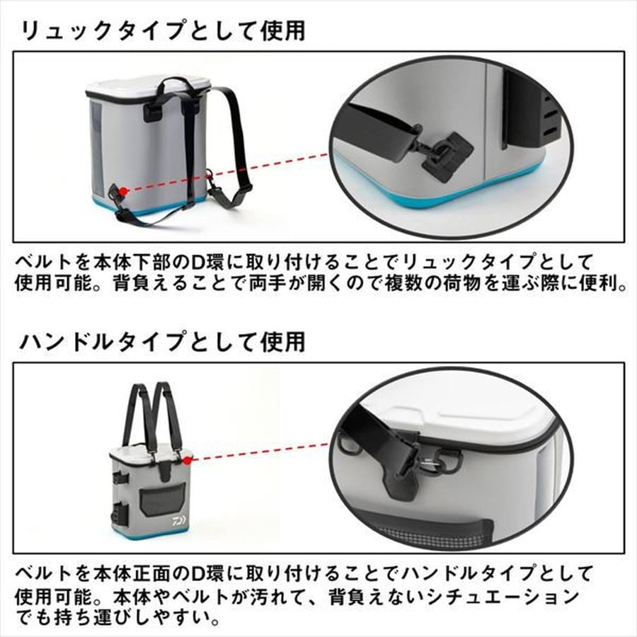 タックルバッグのNEWスタイル、リュックタイプが新登場!両手が開くので複数の荷物を運ぶ際に便利!◆水洗いしやすく、お手入れ簡単なEVAタックルバッグ ◆クローゼットシステム搭載モデルのためシステムツールバッグ(A)がぴったり収納可能 ◆2way仕様でショルダーベルトの付け位置を変更するとハンドルタイプとしても使用可能。 ◆船上の水しぶきに強く開閉しやすいかぶせブタ構造。完全に締められるファスナー付きフタ、開閉に便利な簡易フタ留めフラップ付き。 ◆大口径ロッドスタンド付き。※バッグを置いた状態でご使用ください。