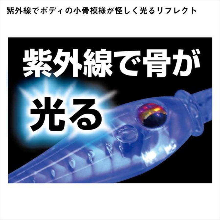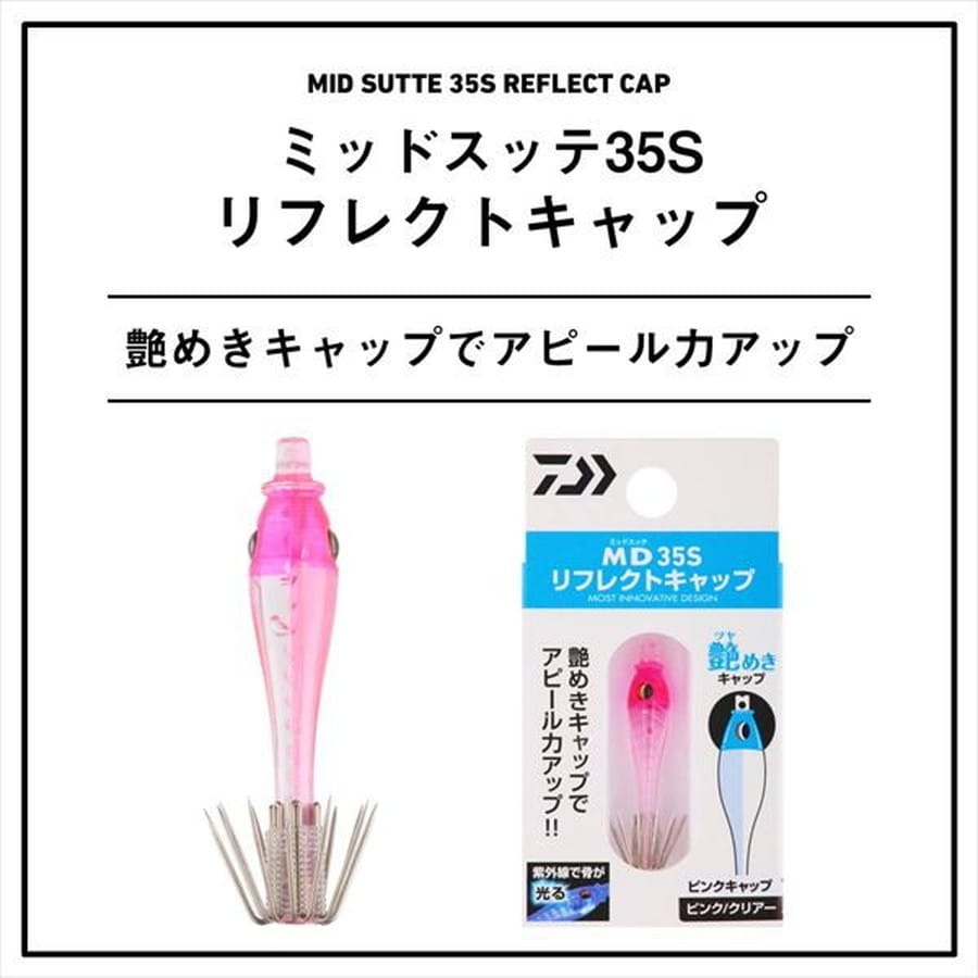 艶めきキャップでアピール力アップ!紫外線でボディの小骨模様が怪しく光る「リフレクト」に新シリーズ追加。帽子部分に光沢感のある塗装を施し、艶めきキャップとしてアピール力アップさせたアイテム「MD35S リフレクトキャップ」が登場。通常のウィリー糸を使用する帽子と違い、シルエットの透け感+キャップとボディ色の組み合わせをしてアピール!