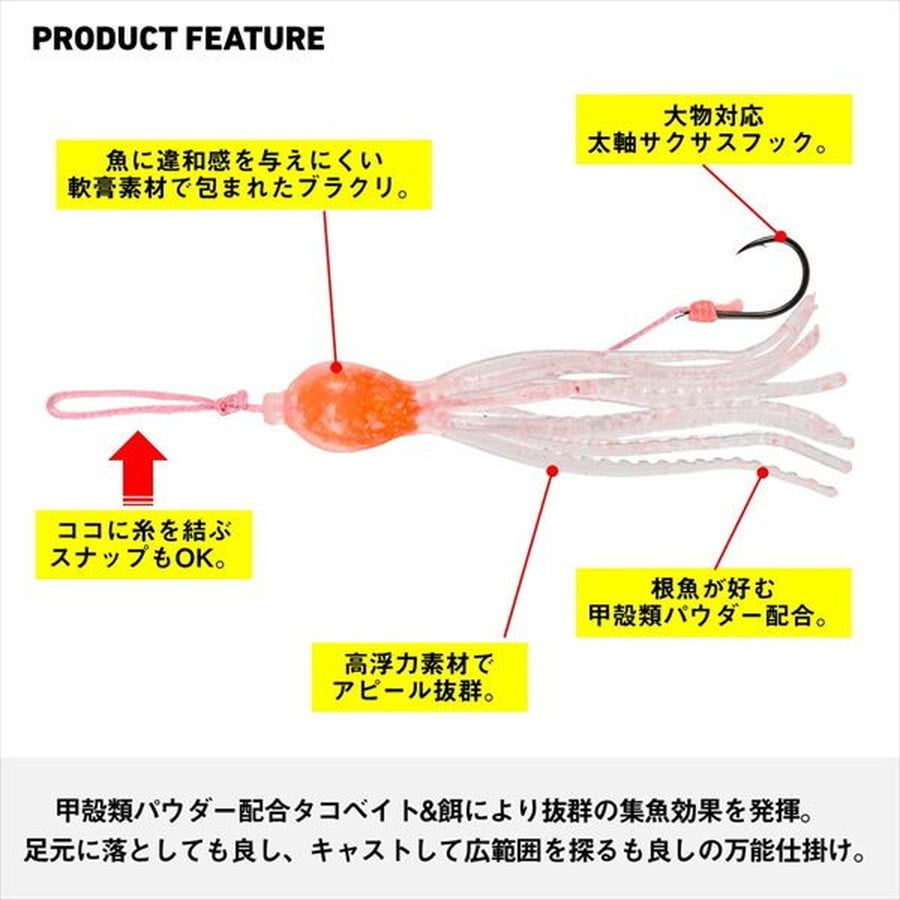 高浮力でフワフワ アピール抜群!タコベイトとブラクリが融合した新感覚ブラクリ!甲殻類パウダー配合タコベイト&餌により抜群の集魚効果を発揮!足元に落としても良し、キャストして広範囲を探るも良しの万能仕掛け。
