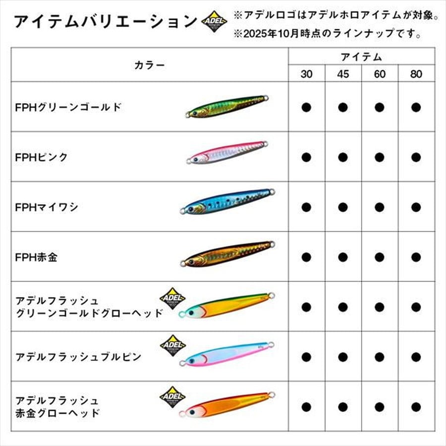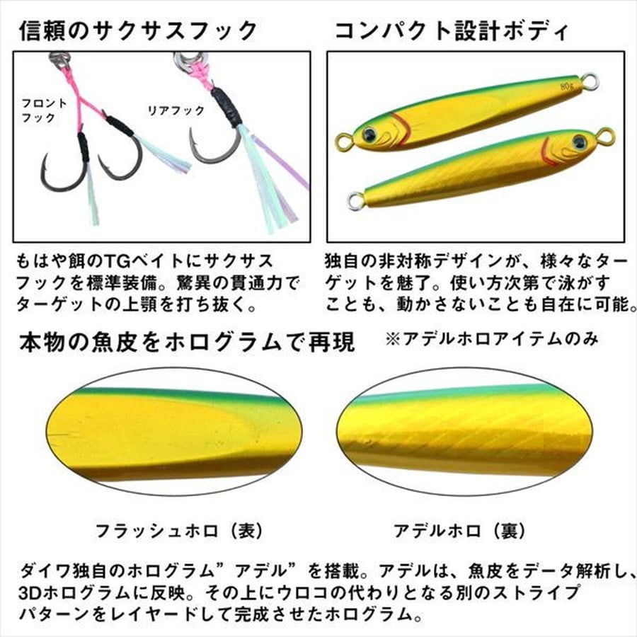 スーパーライトジギング対応。専用フック付き仕様のTGベイト。タイジギやイサキジギングなど、スーパーライトジギングに対応したTGベイトチューンナップモデル。こだわりのフックセッティングで死角のないフッキングを実現。非対称ホログラムの採用でフラッシング効果も抜群。アデルホログラムバージョンも追加されさらにラインナップ充実。