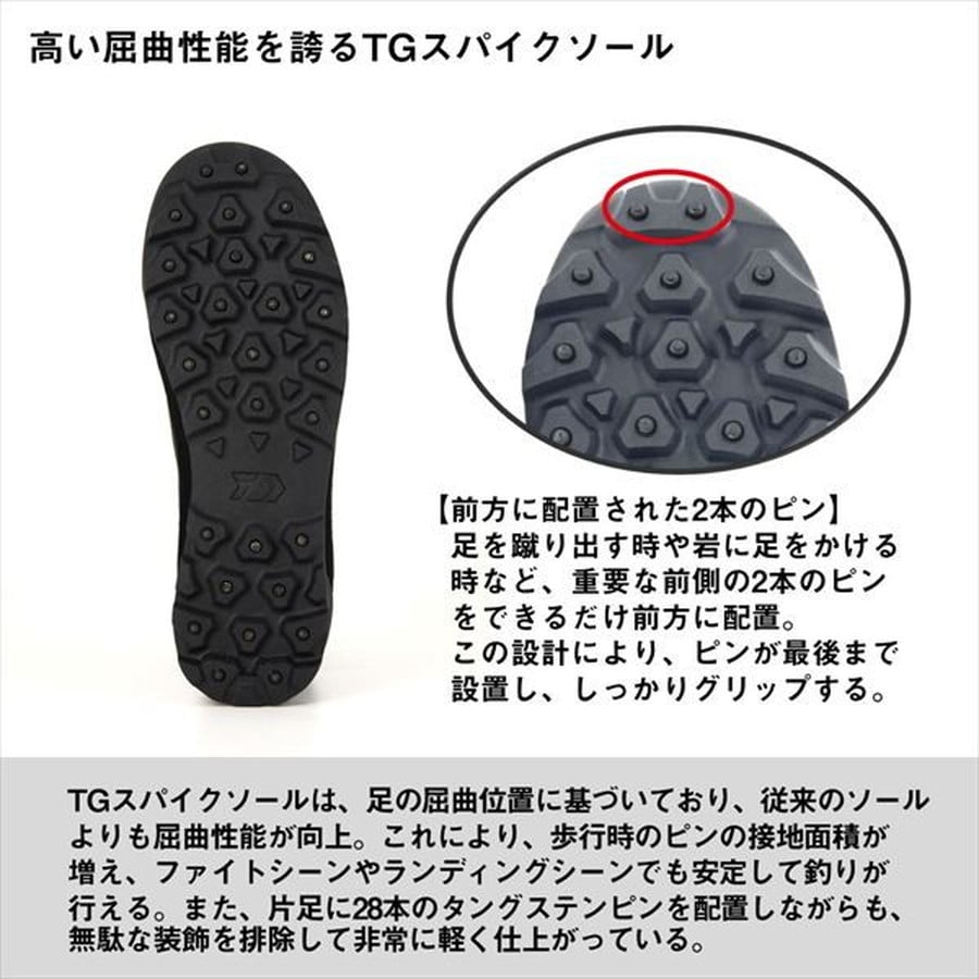 GORE-TEX搭載 × タングステンピン仕様 TGロックショア ゴアテックスシューズが新登場!高い耐久防水性を誇るGORE-TEXメンブレンと、過酷な岩場でも確実なグリップを発揮するタングステンピン搭載ソールを採用。◆タングステンピン・・・ぐらつきを抑え、常にピンが立った状態を維持。従来のステンレスピンに比べ、ピンの土台を拡大。ピンの抜けを防ぎ、突き上げ感を軽減。釣行時の疲労を軽減。◆ノンスリップインソール・・・ノンスリップ加工で靴内の足のズレを防止し、クッション性が高く、快適に釣りが行えるオーソライトインソールを採用。◆高い屈曲性能・・・足の屈曲位置に基づいており、従来のスパイクソールよりも屈曲性能が向上。これにより、歩行時のピンの接地面積が増え、ファイトシーンやランディングシーンでも安定して釣りが行える。