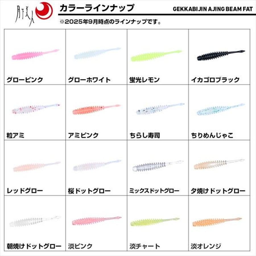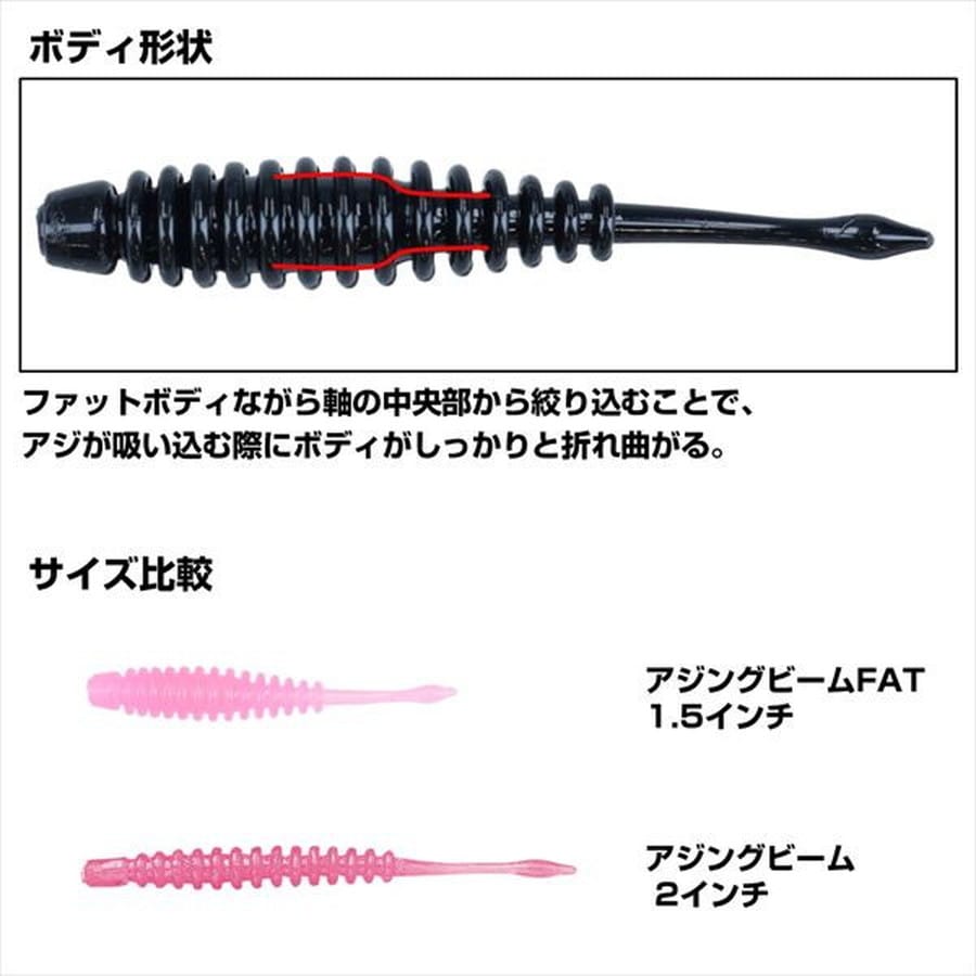 ひとくちサイズコンパクトボディ。プランクトンパターンのスタンダード。アジングビーム2インチを、太く、短くコンパクト化。ボディが太くなった分、水をつかみやすく、ボディのリブと相まって強い水流抵抗を発生。潮の流れに乗せてドリフトする際やノーマルのアジングビームよりもさらにフォールスピードを落としたいときにオススメ。また、タダ巻きでも適度な引き抵抗を感じることができるためアミなどの浮遊ベイトをイミテートしやすい。ボディのコア部には高濃度に凝縮した集魚成分を配合。味とニオイの持続性が大幅アップした。コア:エビ粉