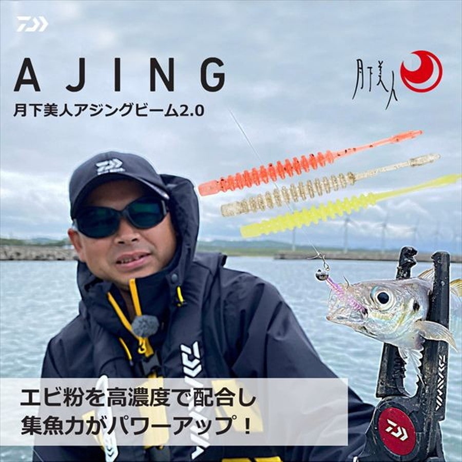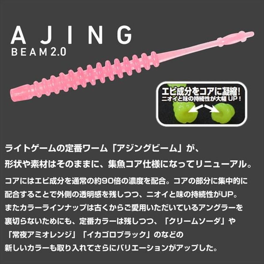 月下美人アジングビーム2.0がコアにエビ粉を高濃度で配合し集魚力がパワーアップ!ライトゲームの定番ワーム「アジングビーム」が、形状や素材はそのままに、集魚コア仕様になってリニューアル。エビ粉をコアの部分に集中的に配合することで外側の透明感を残しつつ、ニオイと味の持続性がUPした。カラーラインナップは、定番カラーは残しつつ、「クリームソーダ」や「常夜アミオレンジ」「イカゴロブラック」の新カラーも追加。