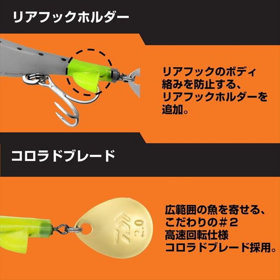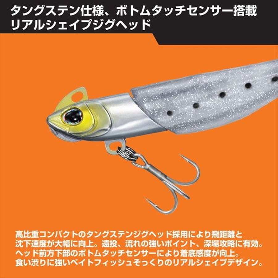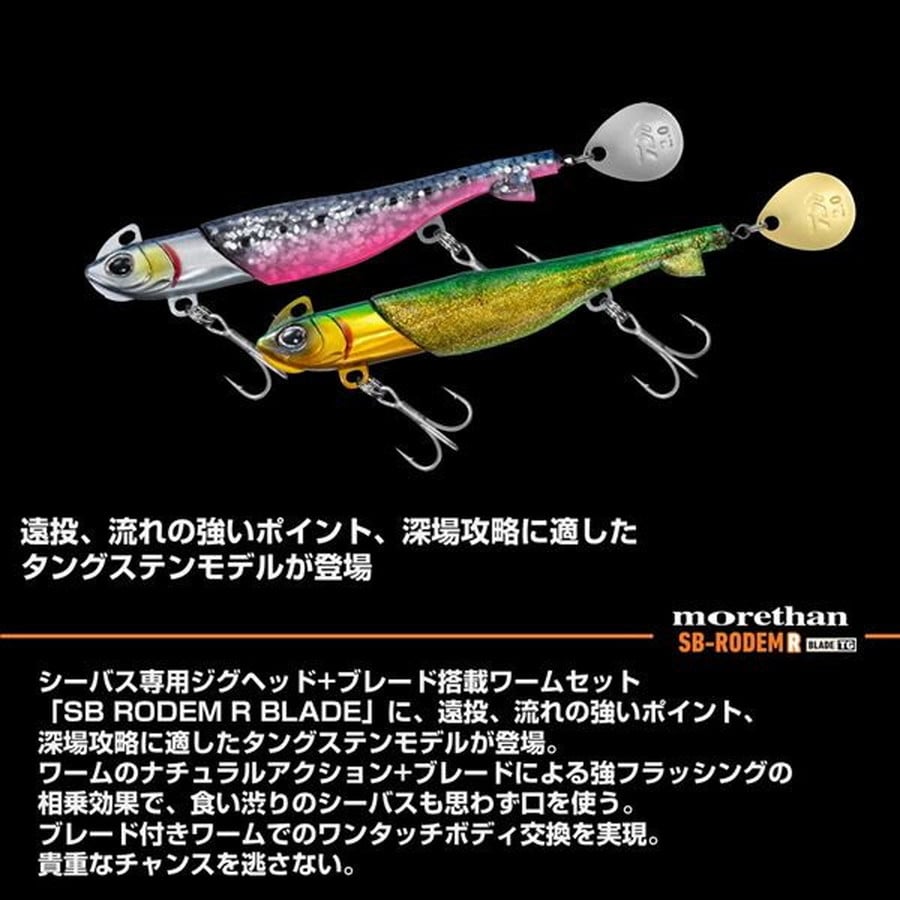 「シーバスロデムRブレード」に、遠投、流れの強いポイント、深場攻略に適したタングステンモデルが登場!ワームのナチュラルアクション+ブレードによる強フラッシングの相乗効果で、食い渋りのシーバスも思わず口を使う。ブレード付きワームでのワンタッチボディ交換を実現!貴重なチャンスを逃さない。「タングステン仕様、ボトムタッチセンサー搭載リアルシェイプジグヘッド」。高比重コンパクトのタングステンジグヘッド採用により飛距離と沈下速度が大幅に向上。遠投、流れの強いポイント、深場攻略に有効。ヘッド前方下部のボトムタッチセンサーにより着底感度が向上。食い渋りに強いベイトフィッシュそっくりのリアルシェイプデザイン。
