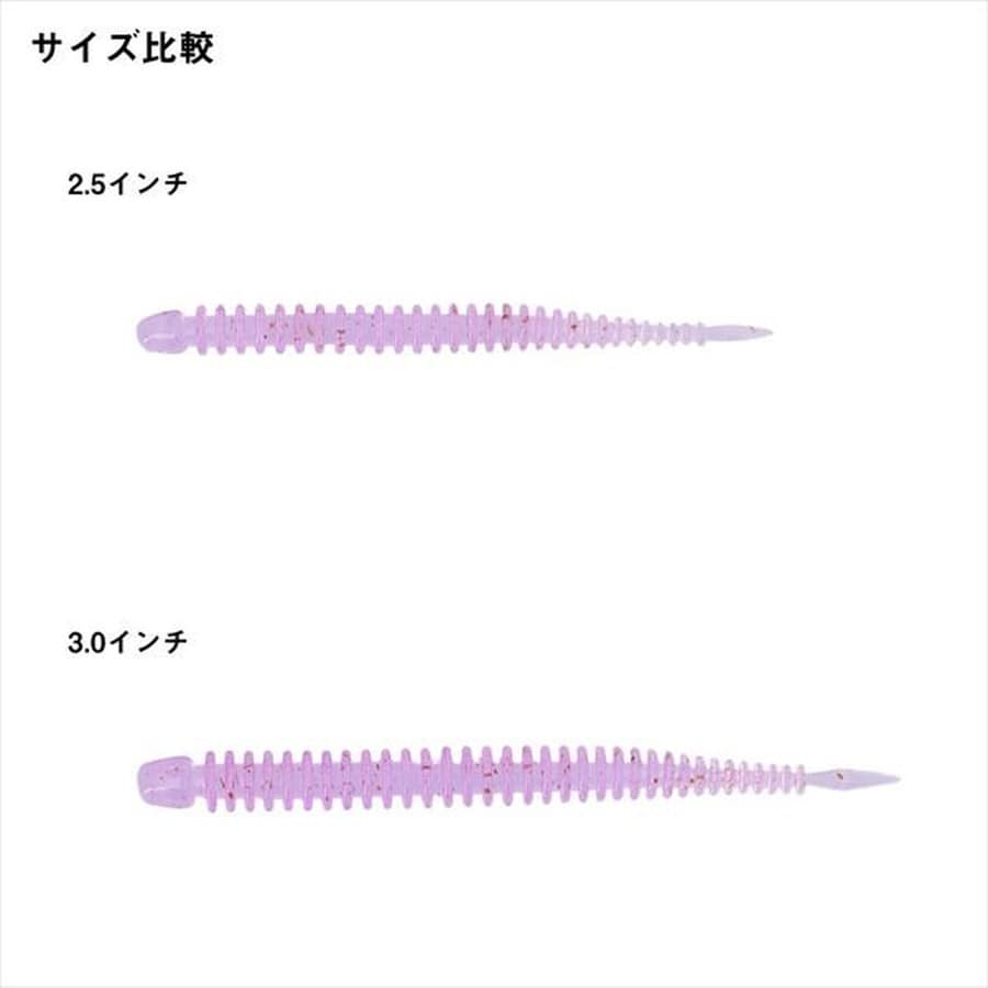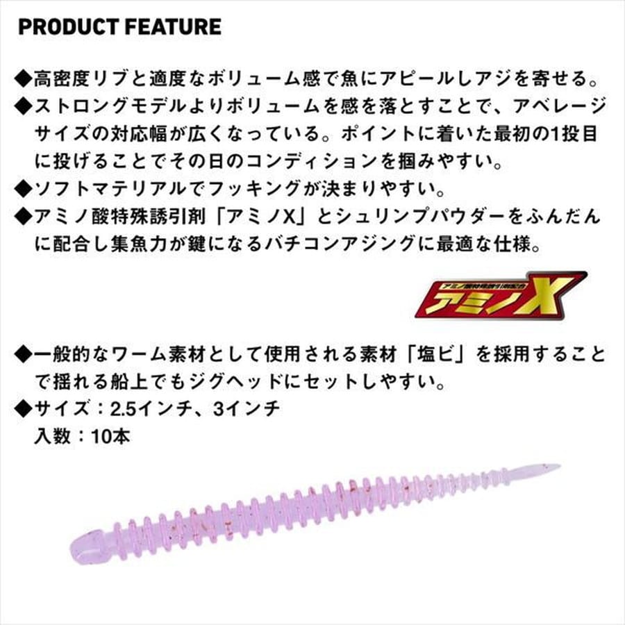 バチコンアジングで最初の1投目に投げたいミドルサイズのボリューム感。高密度リブと適度なボリューム感で魚にアピールしアジを寄せる!MIDモデル:ストロングモデルよりボリュームを感を落とすことで、アベレージサイズの対応幅が広くなっている。ポイントに着いた最初の1投目に投げることでその日のコンディションを掴みやすい。ソフトマテリアルでフッキングが決まりやすい!アミノ酸特殊誘引剤「アミノX」とシュリンプパウダーをふんだんに配合し集魚力が鍵になるバチコンアジングに最適な仕様。一般的なワーム素材として使用される素材「塩ビ」を採用することで揺れる船上でもジグヘッドにセットしやすい!