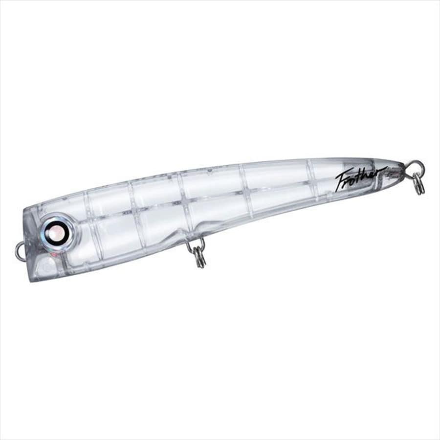 魅惑サウンド×超バブル。湧き上がる熱狂を。ソルティガフロッサーはきめ細やかな泡を纏い、魅惑のポップサウンドを奏でながら水中の魚を魅了するポッパーである。カップ上部は泡を噛みやすい様、深めに設定し、下部は浅くし、泡をたてられるような形状とした。それにより、リトリーブ時に深く潜りすぎず、水面直下を細かな泡と共に泳ぐ。また、ポッパーは高浮力タイプが多く、浮力を保つために沢山のウエイトを積めないが、ソルティガフロッサーはギリギリまでウエイトを積み、また、横風を受けた時にバランスを崩しにくいフォルムで飛行姿勢を安定させ、飛距離のアドバンテージを確保した。水中での浮き姿勢は垂直浮きで、一回目のジャークで潜りすぎず、レスポンスもよくなる。直線的でレスポンスの良いポッパーなので、リズミカルにテンポよく、まるでダイビングペンシルを扱えるポッパーである。