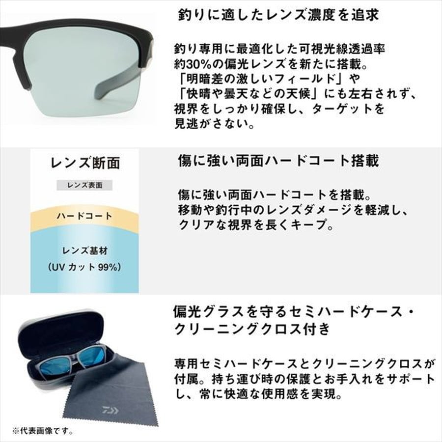 釣りに最適な視界をキープするコストパフォーマンス抜群の偏光グラス新登場!釣りに必要な基本性能をしっかりと備えた、コストパフォーマンスに優れた偏光グラス。アウトドアサングラスの延長ではなく、釣り専用として最適なレンズ濃度を徹底追求。水中の変化や魚の動きを見逃さず、晴天・曇天を問わず快適な視界をキープ。軽量かつ薄型のトリアセテートレンズを採用し、長時間の使用でもストレスを感じにくい設計。さらに、両面ハードコート加工により、傷にも強く、耐久性にも優れている。セミハードケースとクリーニングクロスが付属し、持ち運びやメンテナンスも快適。釣り初心者からベテランアングラーまで、あらゆるフィールドで活躍する1本。軽量なハーフリム設計の普段使いもしやすいウェリントンタイプ。帽子着用時でも脱着しやすいストレートテンプルを採用し、滑り止め付き鼻パッドを搭載。