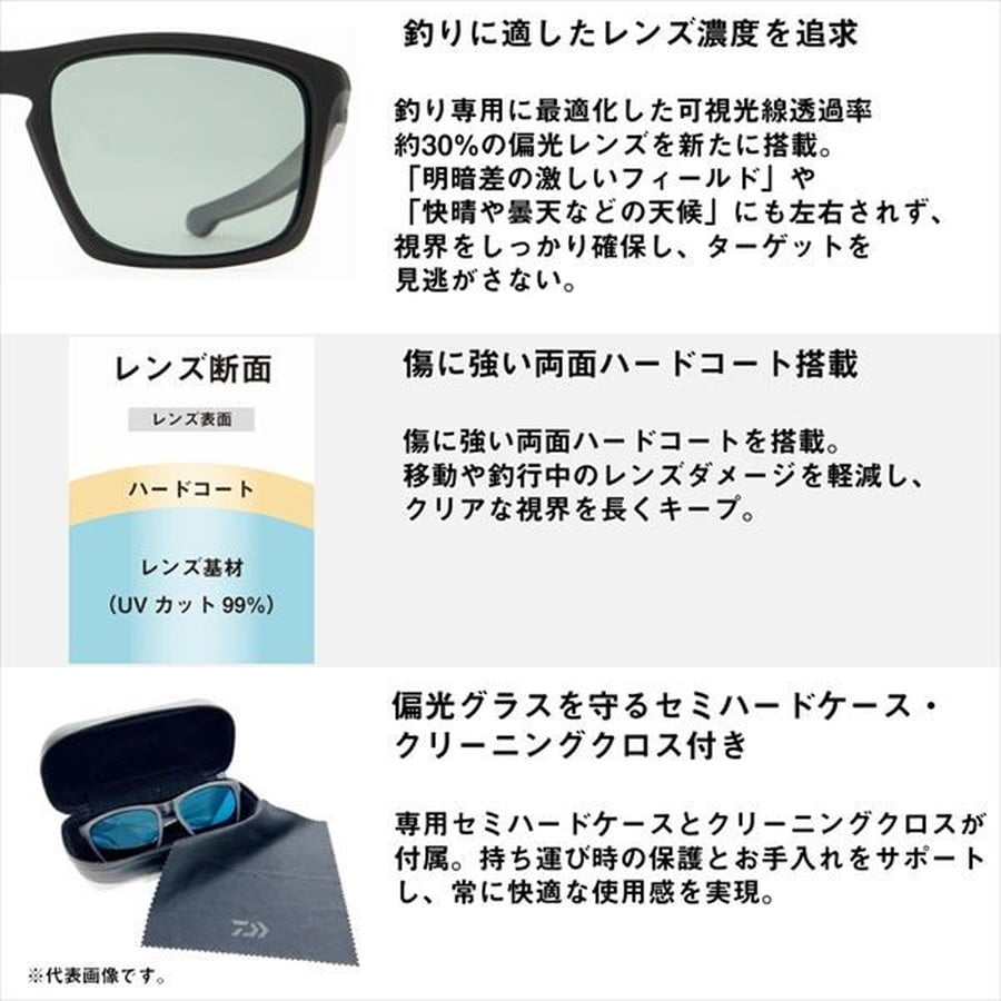 釣りに最適な視界をキープするコストパフォーマンス抜群の偏光グラス新登場!釣りに必要な基本性能をしっかりと備えた、コストパフォーマンスに優れた偏光グラス。アウトドアサングラスの延長ではなく、釣り専用として最適なレンズ濃度を徹底追求。水中の変化や魚の動きを見逃さず、晴天・曇天を問わず快適な視界をキープ。軽量かつ薄型のトリアセテートレンズを採用し、長時間の使用でもストレスを感じにくい設計。さらに、両面ハードコート加工により、傷にも強く、耐久性にも優れている。セミハードケースとクリーニングクロスが付属し、持ち運びやメンテナンスも快適。釣り初心者からベテランアングラーまで、あらゆるフィールドで活躍する1本。スクエアとウィリントンをかけ合わせた無骨な雰囲気のあるウェリントンタイプ。帽子着用時でも脱着しやすいストレートテンプルを採用。