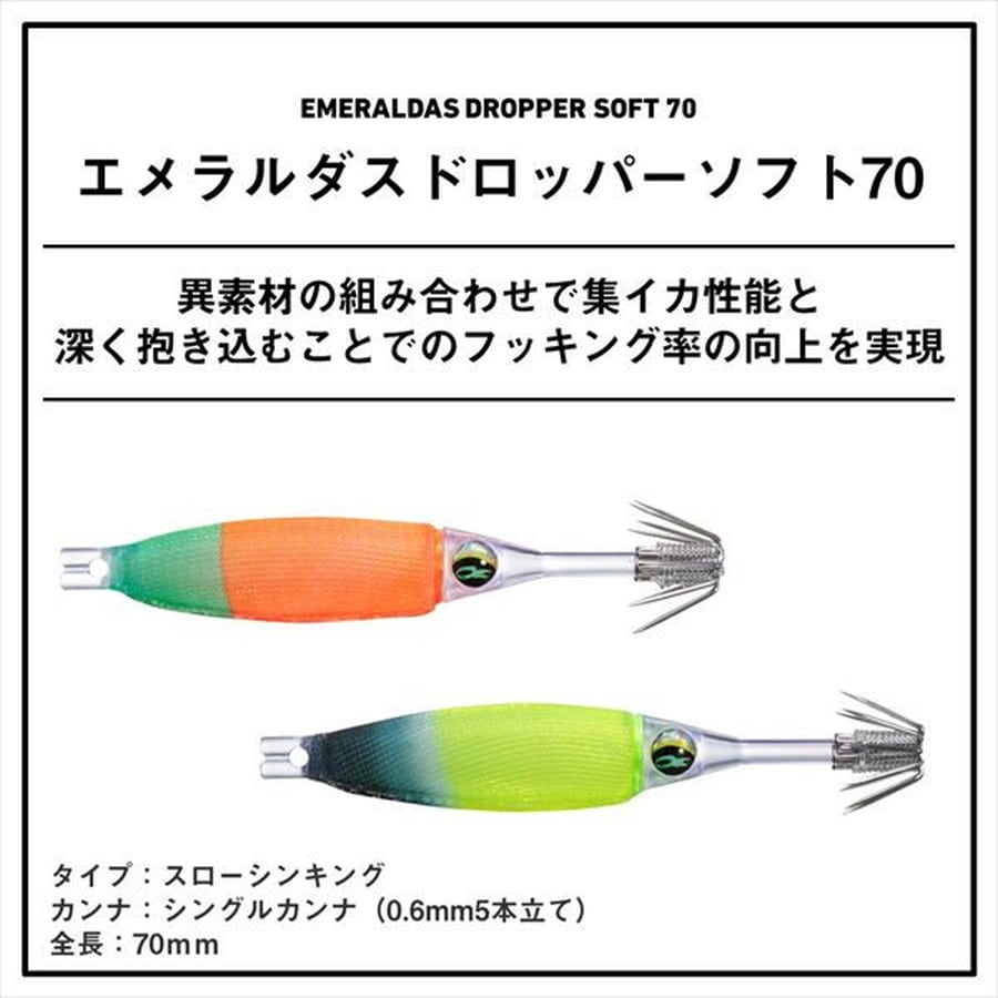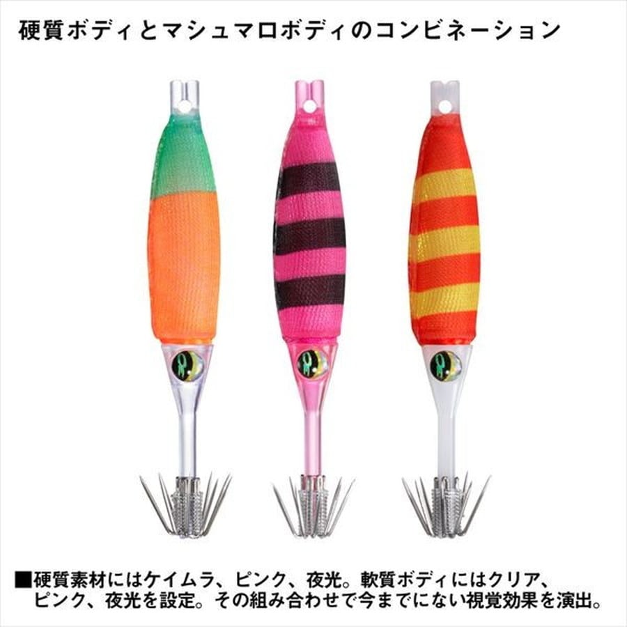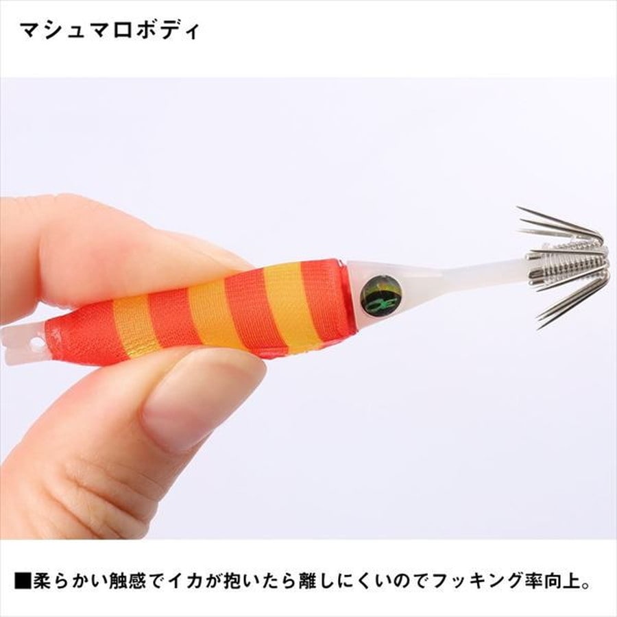 異素材の組み合わせがもたらす新感覚ドロッパー。硬質素材のボディーの輝きと軟質素材のボディーの組み合わせで、集イカ性能と深く抱き込むことでのフッキング率の向上を実現した新感覚ドロッパー。絶妙な浮力と発光ボディで、イカを誘いバイトに持ち込む。バイトしてからはマシュマロボディのベイトフィッシュライクな触感で、より深く抱き込みフッキングチャンスを増やす。強度と刺さりの良さを両立した日本製素材のスーパーシャープフックにより、フッキング率が向上。