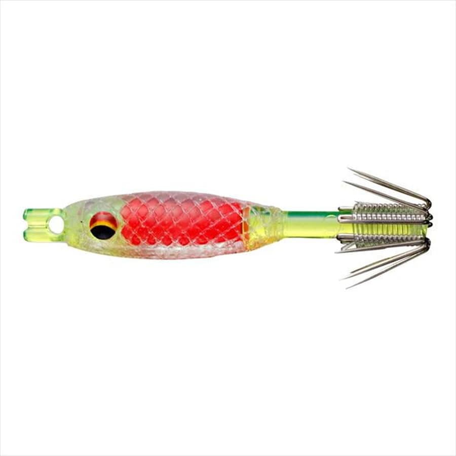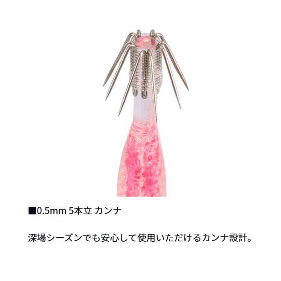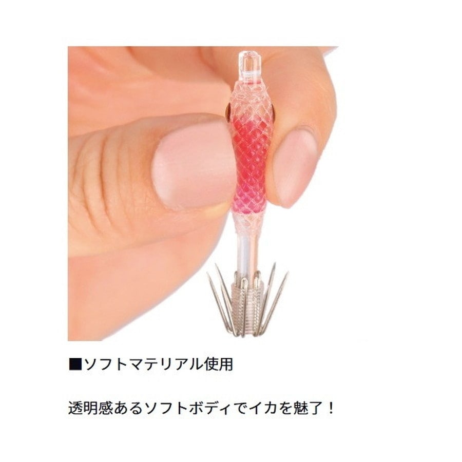 透明感あるソフトボディがイカを魅了!透明感あるソフトボディでイカを魅了!マルイカスッテにソフトマテリアルを新採用!マルイカの繊細なアタリ(触り)を掛ける為にはボディと針に掛かりしろが必要。針掛かりをスムーズにする為の細身ボディにこだわりつつ、イカが触れる外側はソフトに仕上げてイカが見切って離しづらくした設計。内側の色が透明のエラストマー越しに透けて見せる事でぼんやり怪しくイカにアピール!