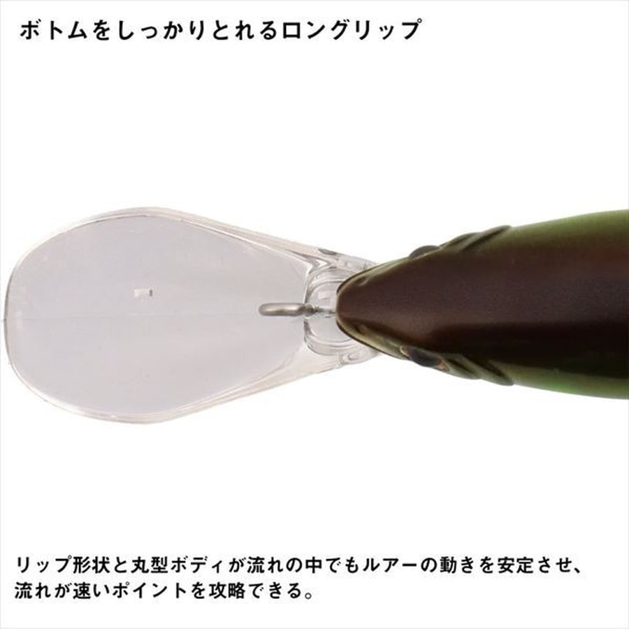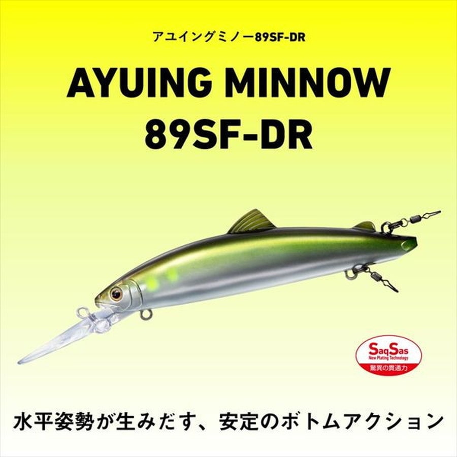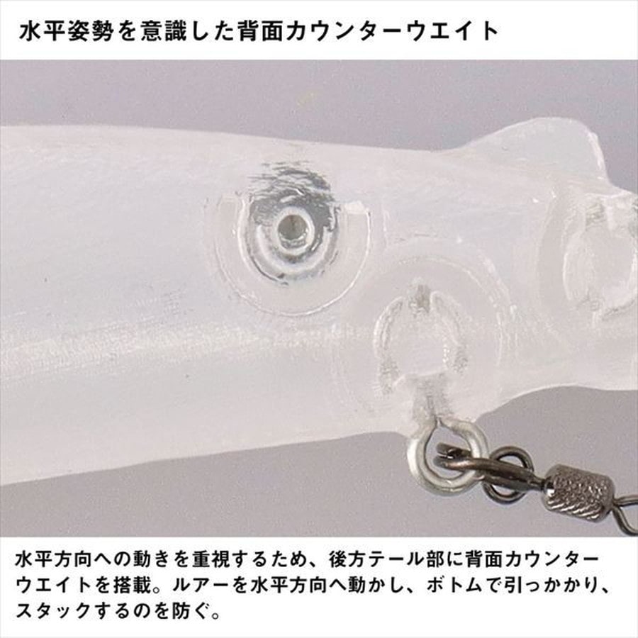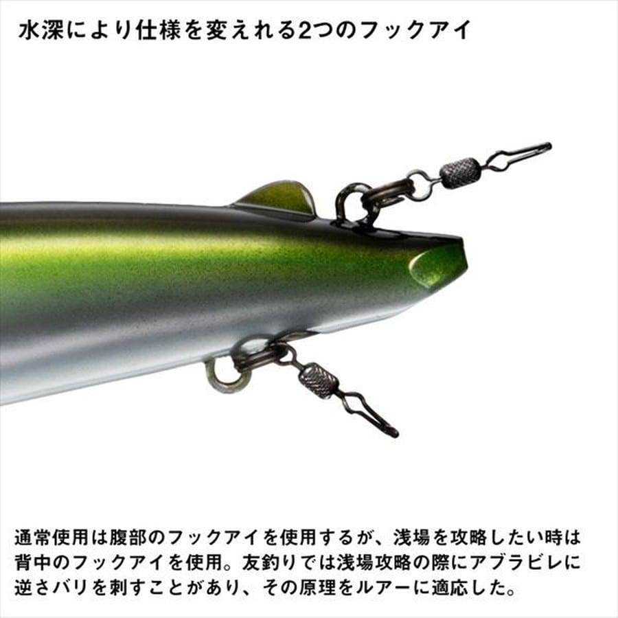 水平姿勢が生みだす、安定のボトムアクション!AYUINGミノー89SF-DRは、ボトムトレース能力が高く、ボトム付近をしっかりと泳がせることが可能。背面テール側にウエイトを入れており、テールの浮力を抑え、泳ぎの姿勢をより水平に保つことができる。ルアーが水平に泳ぐことにより、リップがボトムに刺さらず、バランスを崩すことが少ない。AYUINGミノー89SF-DRには2つのフックアイがある。一つ目は腹部にあるフックアイ。今まではこのアイだけであったが、新たに背面後方部のアブラビレの後ろのポジションにフックアイを設定した。友釣りでは浅場を攻略をする際、逆さバリをアブラビレに刺し、根掛りリスクを減らす釣り方があり、その様な釣り方からヒントを得たのが背面後方部のフックアイである。そして、腹部後方のフックアイの後ろにはマグネットが埋め込まれており、スプリットリングを固定し、イカリをまっすぐ後方へ垂らす働きをする。リップ裏にもアイが付いており、こちらはシンカーなどを装着し、チューン出来るようになっている。