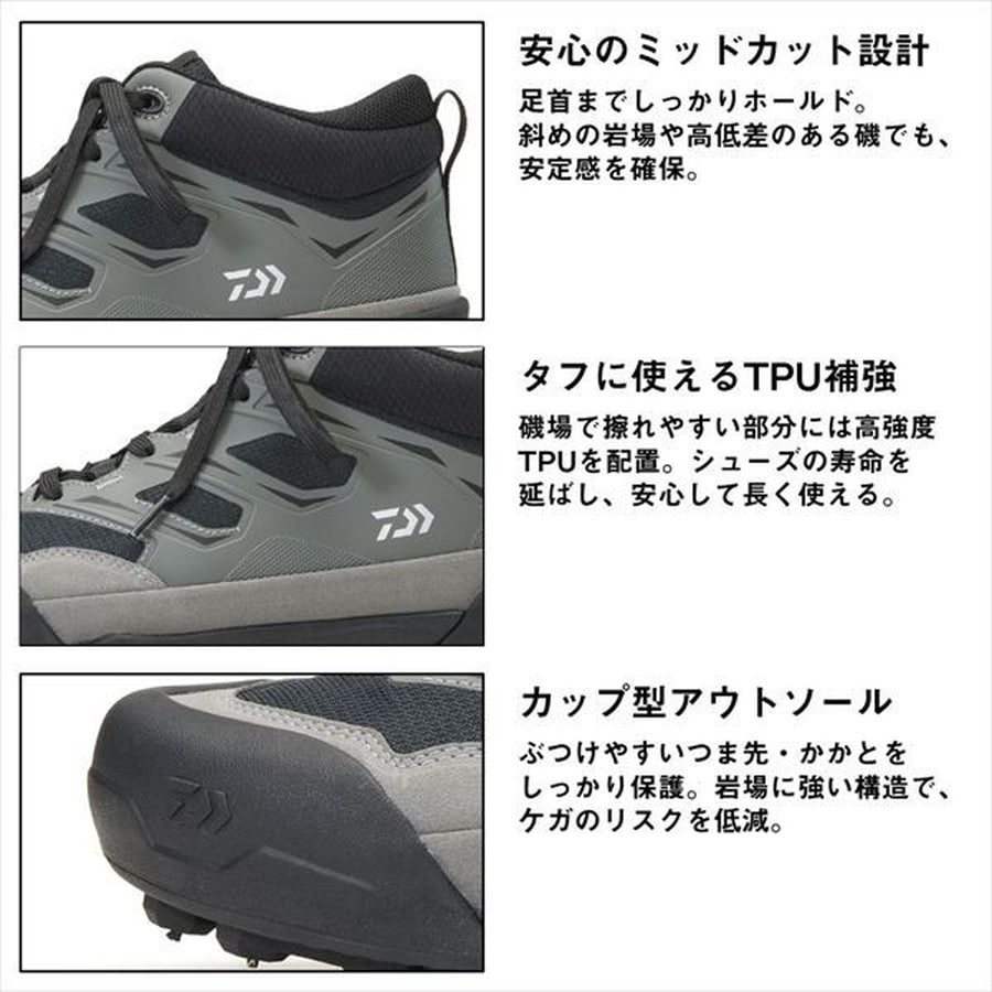 荒磯に立つ、その一歩を支える磯シューズ。磯に立つ瞬間、胸が高鳴る。でも、同時に感じるのは「足元の不安」。ダイワのフィッシングシューズは、そんな釣り人の一歩を支えるために生まれた。強度と動きやすさを両立したデザイン、足首までしっかり守る安心のミッドカット設計。つま先やかかとをガードするカップ型アウトソールが、荒磯でのぶつけやすいシーンにも対応。求められるのは、安心感と使いやすさ。そのどちらも兼ね備えたこのシューズで、磯での釣りへ一歩踏み出そう。