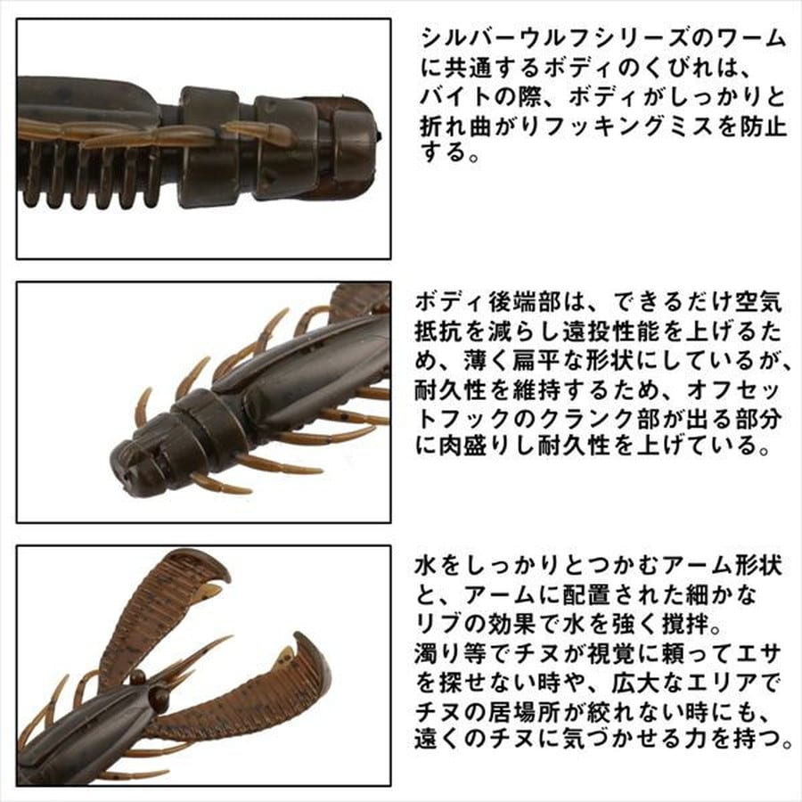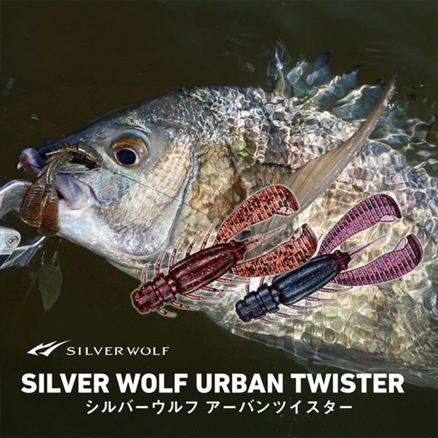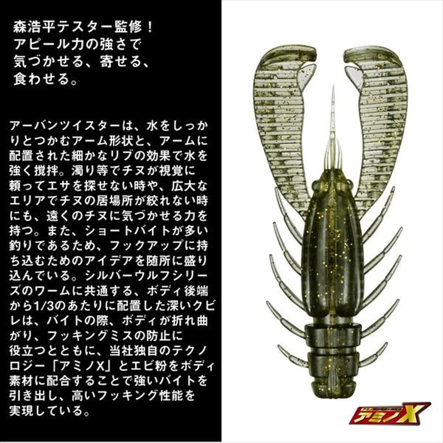 森浩平テスター(通称:もりぞー)監修 アピール力の強さで気づかせる、寄せる、食わせる。アーバンツイスターは、水をしっかりとつかむアーム形状と、アームに配置された細かなリブの効果で水を強く撹拌。濁り等でチヌが視覚に頼ってエサを探せない時や、広大なエリアでチヌの居場所が絞れない時にも、遠くのチヌに気づかせる力を持つ。また、ショートバイトが多い釣りであるため、フックアップに持ち込むためのアイデアを随所に盛り込んでいる。シルバーウルフシリーズのワームに共通する、ボディ後端から1/3のあたりに配置した深いクビレは、バイトの際、ボディが折れ曲がり、フッキングミスの防止に役立つとともに、当社独自のテクノロジー「アミノX」とエビ粉をボディ素材に配合することで強いバイトを引き出し、高いフッキング性能を実現している。