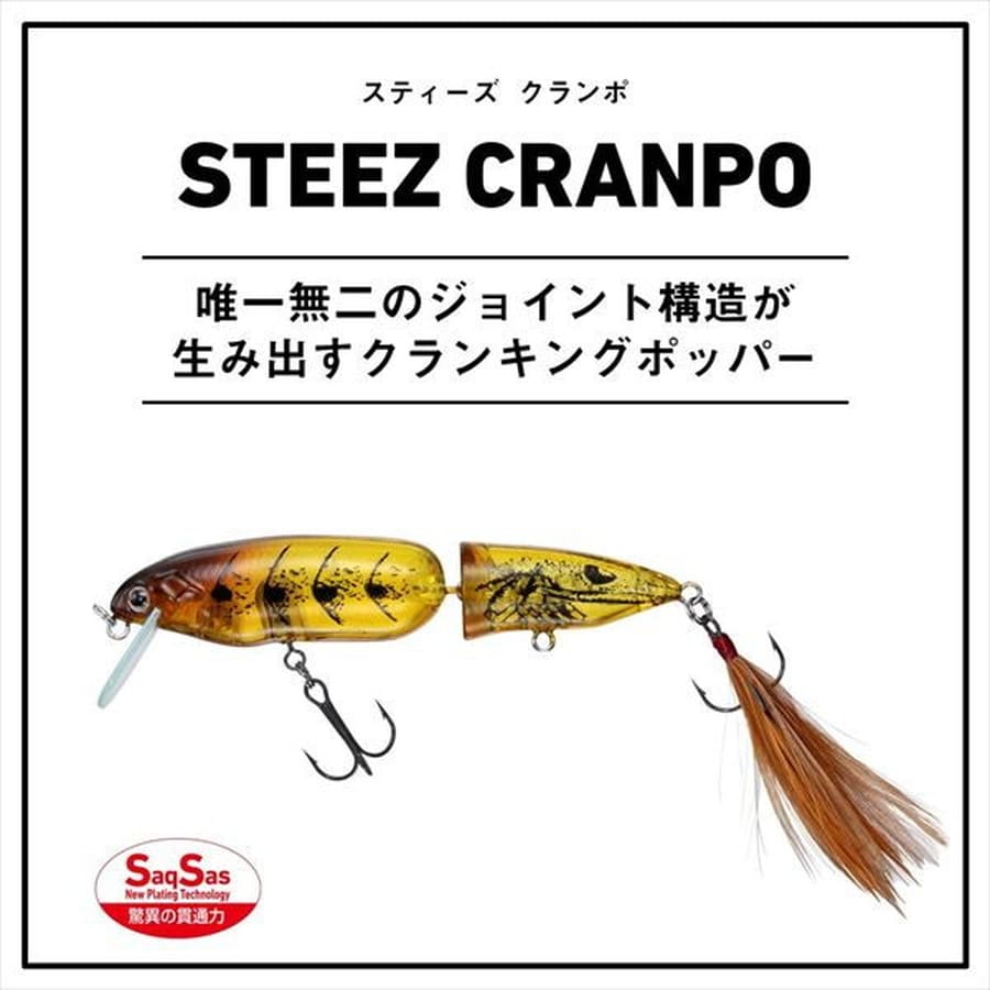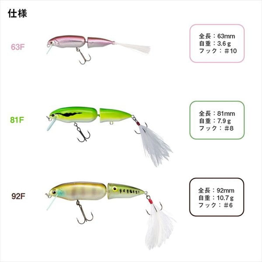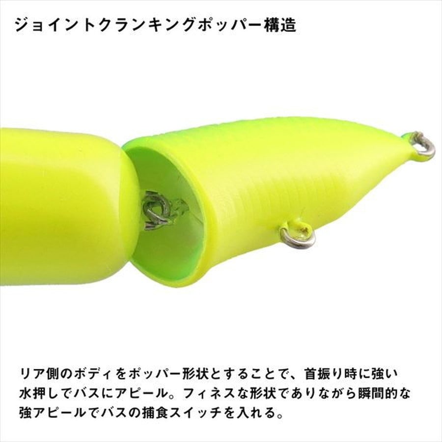 リアボディがポッパー!●唯一無二のジョイント構造が生み出す新感覚表層系ルアー!トーナメンターとしても活躍する宮嶋駿介監修の新感覚表層系ルアー。最も特徴的なのがリアボディをポッパー形状にしている点で、移動距離を抑えつつ強い水押しでアピールする。ポップ音やスプラッシュを出すことも可能で多彩なアプローチが可能となっている。ジョイント構造のボディは首振りアクションも得意で連続トゥイッチでは綺麗な180度ターンが可能。リアフックにはフェザーフックを採用し、ただ巻き時により艶めかしく動き、視覚的にもバスにアピールする。フロントフックアイはスイベル仕様。掛かった獲物は逃がさない。