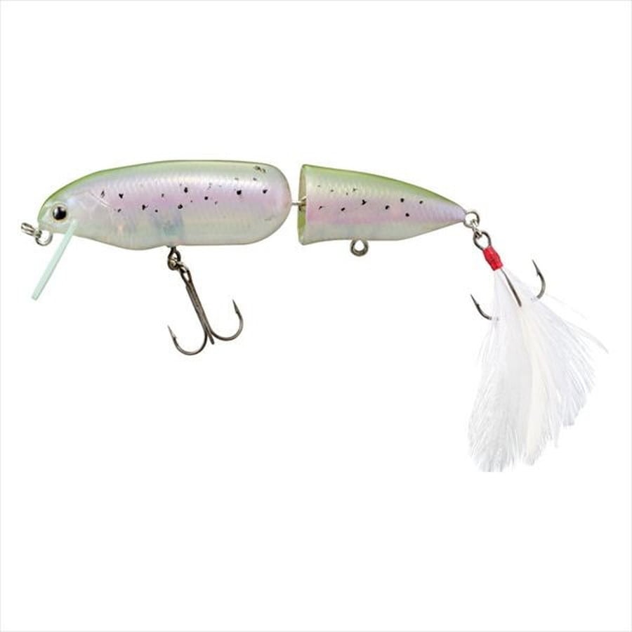 リアボディがポッパー!●唯一無二のジョイント構造が生み出す新感覚表層系ルアー!トーナメンターとしても活躍する宮嶋駿介監修の新感覚表層系ルアー。最も特徴的なのがリアボディをポッパー形状にしている点で、移動距離を抑えつつ強い水押しでアピールする。ポップ音やスプラッシュを出すことも可能で多彩なアプローチが可能となっている。ジョイント構造のボディは首振りアクションも得意で連続トゥイッチでは綺麗な180度ターンが可能。リアフックにはフェザーフックを採用し、ただ巻き時により艶めかしく動き、視覚的にもバスにアピールする。フロントフックアイはスイベル仕様。掛かった獲物は逃がさない。