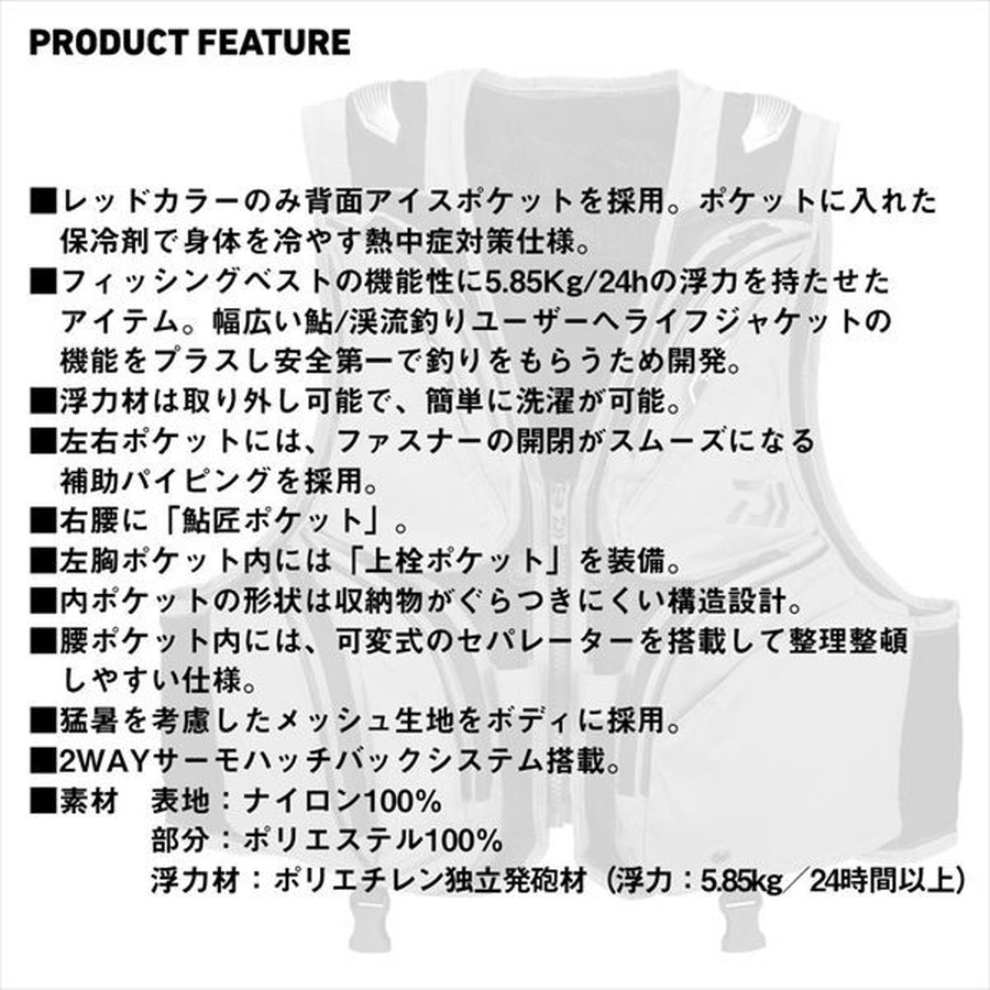 鮎/渓流ベストの機能性に安全性をプラス。フィッシングベストの機能性に5.85Kg/24hの浮力を持たせたNEWアイテム。幅広い鮎/渓流釣りユーザーへライフジャケットの機能をプラスし安全第一で釣りを楽しんでもらうため開発。浮力材は取り外し可能で、簡単に洗濯が可能。左右ポケットには、ファスナーの開閉がスムーズになる補助パイピングを採用。右腰に「鮎匠ポケット」、左胸ポケット内には「上栓ポケット」を装備。内ポケットの形状は収納物がぐらつきにくい構造設計。腰ポケット内には、可変式のセパレーターを搭載して整理整頓しやすい仕様。猛暑を考慮したメッシュ生地をボディに採用。2WAYサーモハッチバックシステム搭載。