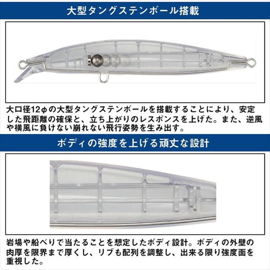 すべてが高次元。その翼が未開をひらく。SALTIGA SKYFIN。それは大型魚を獲るために生まれたビッグミノー。翼を持ち、空を駆けるかのような安定した飛行姿勢と大型タングステンボールによる重心移動システムが、飛距離面で大きなアドバンテージを生み出す。アクションはハイアピールスローロール。大きくゆったりとしたロールアクションが水中で存在感を放ち、遠くのモンスターを呼び寄せる。トップに出ない魚、喰い気のない魚をも自然に口を使わせるには、ミノーは必然。そしてSALTIGA SKYFINは釣り人を新たな領域へと誘う。