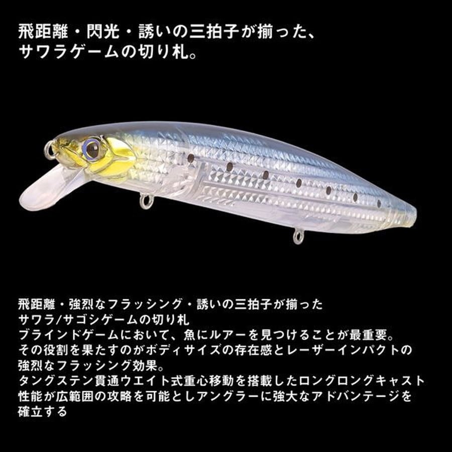 飛距離・閃光・誘いの三拍子が揃った、サワラゲームの切り札。ブラインドゲームにおいて、魚にルアーを見つけさせることが最重要。その役割を果たすのがボディサイズの存在感とレーザーインパクトの強烈なフラッシング効果。タングステン貫通ウエイト式重心移動を搭載したロングキャスト性能が広範囲の攻略を可能とし、アングラーに強大なアドバンテージを確立する。また、高速リトリーブからスローまであらゆるスピード域で安定したウォブンロールアクションを維持し、サワラ・サゴシなど動きすぎないダート幅と食わせの間で魚を反応させる。3フック仕様によりショートバイトや体当たりにも確実に対応し、どの位置で喰ってきても高確率でフッキングしバラシを大幅に軽減する。