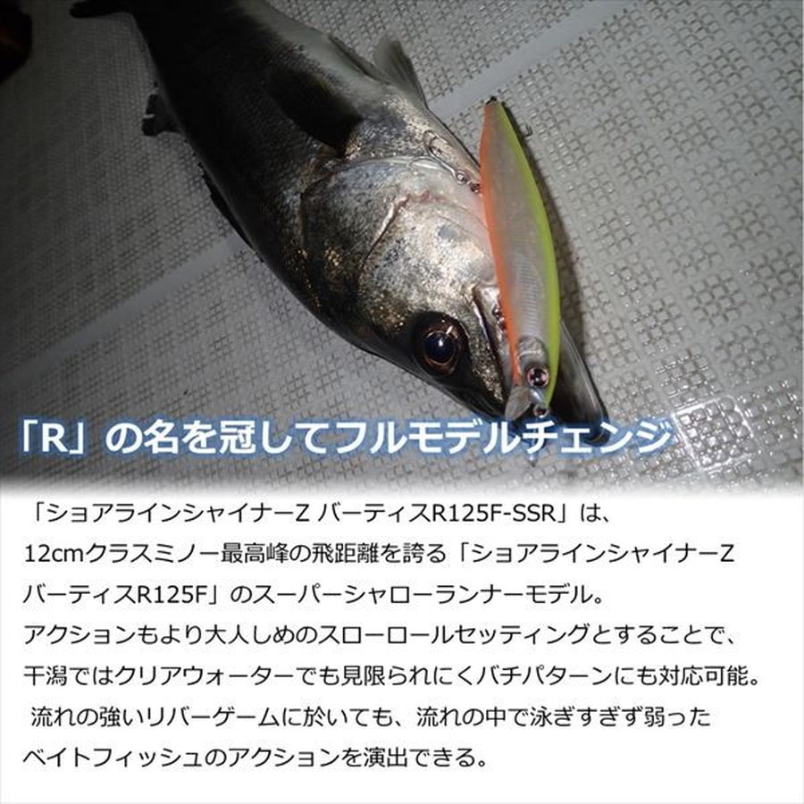 新たなる飛びの伝説を引き継いだSLZバーティスRに、SSR(スーパーシャロー)モデルが登場!飛びの伝説を引き継いだスーパーシャローランナー「SLZバーティス120F-SSR」が、「R」の名を冠してフルモデルチェンジ!さらに、遠くのシャロ―を攻略したい、12cmクラスでは届かない、アピールが弱い、ベイトが大きい、そんな時に最適な140サイズも登場。干潟、河川の岸際など水深の浅いステージや、シーバスの活性が高く浮き気味のときに効果的な最大50cmダイブ仕様。アクションもより大人しめのスローロールセッティングとすることで、干潟ではクリアウォーターでも見限られにくバチパターンにも対応可能。 流れの強いリバーゲームに於いても、流れの中で泳ぎすぎず弱ったベイトフィッシュのアクションを演出できる。