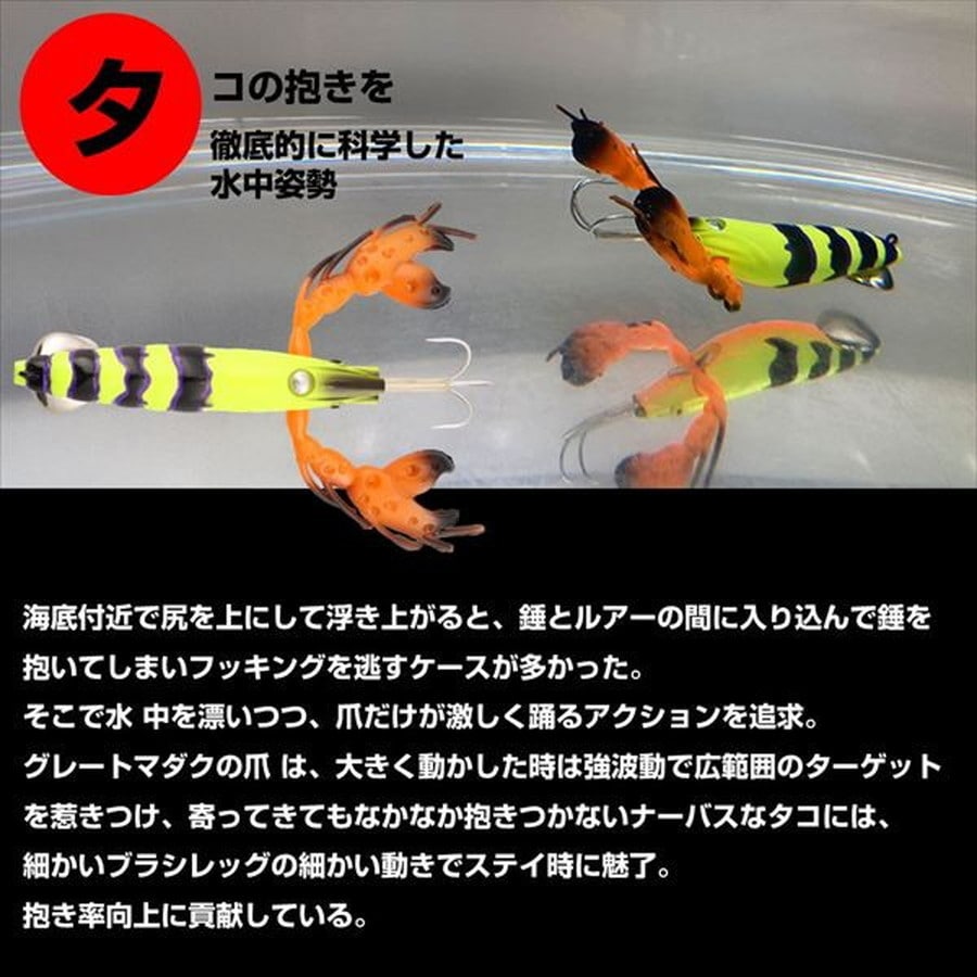 マダクが劇的なバージョンアップ!使ってわかる、抱きを科学した真蛸ルアー真蛸専用ルアーマダクが、更に抱きを科学してバージョンアップ。新たな爪を与えられ、よりリアルな爪の動きで真蛸を魅了。標準装備のマダクフックに加え、マダクフックビック(別売)も使用できるようになり、大 型の真蛸にも安心のファイトが可能。潮流が速い時にも有効。