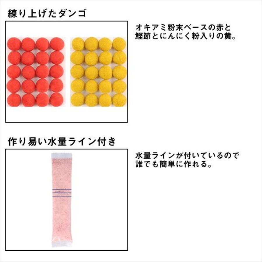 自分好みに作れる経済的なダンゴエサ。好みのエサを自在に楽しく作れる粉末タイプ。硬さや粘りを調整でき、さまざまな状況に対応可能。4スティック(4本)入りで経済的な仕様となっており、1スティックで約15mm径のダンゴが20~25粒作れる。必要な量だけ作り、残ったスティックは次回以降に回せるため無駄がない。状況に合わせて選べる2タイプを用意。オキアミベースの赤はアミノ酸の旨みで喰わせ、色とニオイでアピールする黄はニンニクとイノシン酸(鰹節)の旨みで喰わせる。さらに、エサ作り用のビニール袋付きで、スティックの粉末と水量ラインまでの水を入れて揉むだけで簡単に作れる。内容量は24g×4スティックで、出来上がりは約100g(80~100粒/径約15mm)。