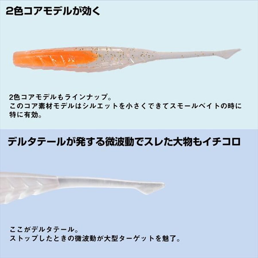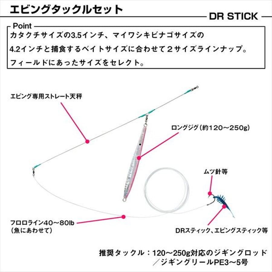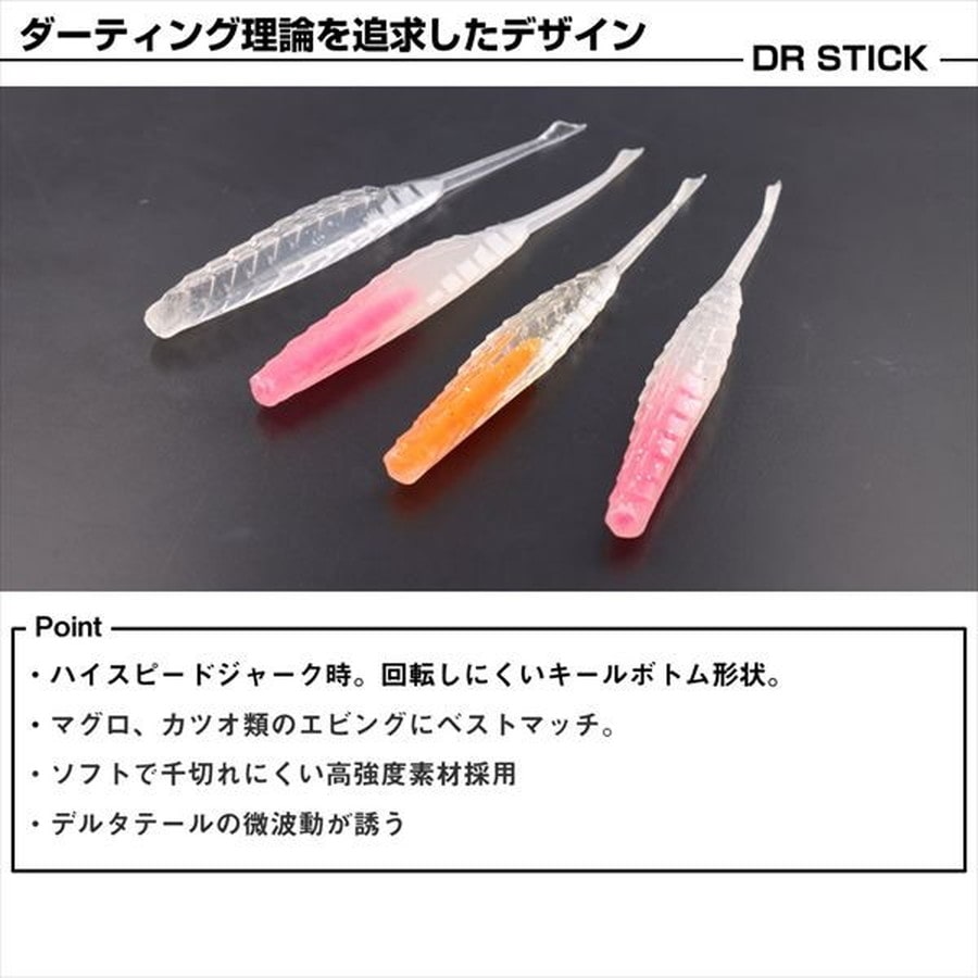 エビングで熱望されていたDRスティックが完全復刻。マグロ、カツオ類のエビングにベストマッチ。デルタテールの微波動が誘う。ソフトで千切れにくい高強度素材採用。