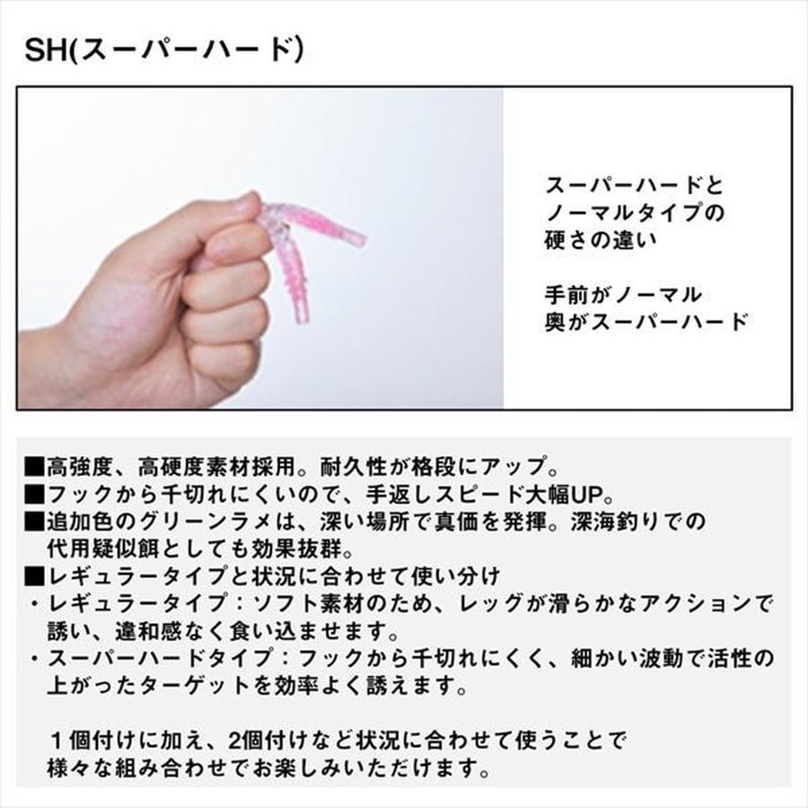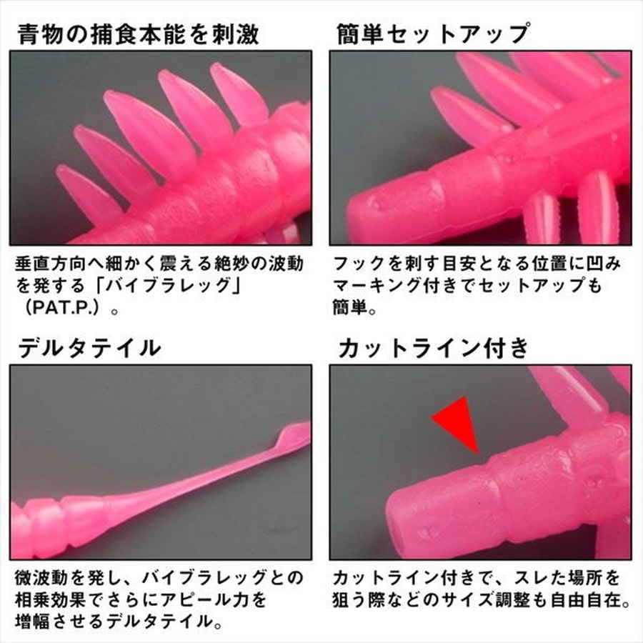 村越正海監修、高強度素材の青物エビング専用ワーム。キハダやヒラマサをはじめとする青物狙いのエビングに特化した高強度素材、専用設計のワーム。エビングの提唱者である村越正海のこだわりが随所に盛り込まれており、実釣テストでは「DRスティック」の4倍以上のヒット率を叩き出した例もある。反応があっても食いの渋い時、特に根につくような状態で食い気が渋くなった青物や相模湾のキハダなどにも非常に有効。1個付けではシンキング、2個付けではサスペンドになる浮力設定で、潮にあわせて調整が可能。2個付けの組み合わせのベストマッチをあらかじめ組み合わせた上下二色成型モデル。特に相模湾キハダ人気のカラーを厳選。浮力バランスをとりやすい高浮力タイプ。レッグによりハリスがストレッチされるのでクイックな反応で食わせられる。
