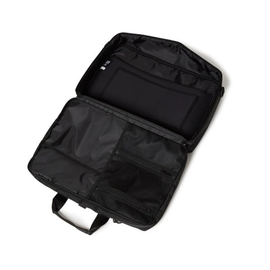 箱型のシルエットが特徴的な3-Way仕様のブリーフバッグです。ブリーフバッグ、バックパック、ショルダーバッグの3パターンでの使用が可能です。・メインコンパートメントの内側には撥水生地を使用・外側のコンパートメント内部に多数の収納ポケットを配備。・キーフックが付属する全面メッシュ仕様のメインコンパートメント片側。・クッション付きポケットと小物収納に便利なメッシュポケット配備したメインコンパートメント片側。・背面ポケットに収納可能なバックパック用ストラップ。・取外し収納可能なショルダーストラップ。