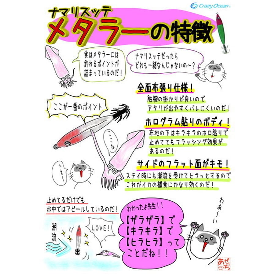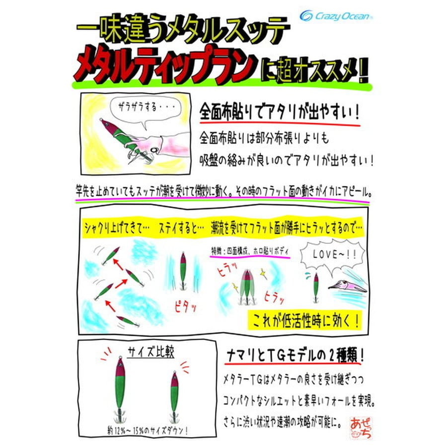 「鉛スッテ」と呼ばれてはいますが、言い方を変えれば「布を巻いたメタルジグ」。そこで、今回はジグの理論を取り入れた鉛スッテを1年以上テストして参りました。一般的には、青物などが好むのは「スライド系アクション」。マダイや根魚が好む「ヒラ打ち系アクション」、タチウオやシーバスなどが好むのは「無動(あまり動かない)系アクション」。イカもフィッシュイーターな訳ですから、きっと好みのアクションがあるはずです。色々とテストした結果、「派手過ぎず、地味過ぎないアクション」が安定して釣れました。曖昧な表現ですが「ちょうどいい」と感じるストライクゾーンのアクションがあります。感覚的には「誘った時は軽い姿勢変化」と「止めた時に潮を受けても過剰にヒラつかない」。この部分が「ちょうどいい」と感じるアクションがイカを魅了するようです。左右非対称カラー:左右非対称の明減効果で、アピール力抜群!