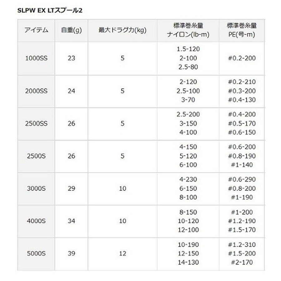 ATDの特性はそのままに、初動レスポンスをさらに向上させる『ATD TYPE-L』を搭載。使用ラインに合わせ自分好みのスプールをカスタム。19CERTATE、21LUVIAS AIRITYに装着することで簡単に「ATD-TYPE-L」へチューンアップが可能。★SLPW EX LT4000S スプール2 自重:(g)10 最大ドラグ力(kg)10 標準糸巻量:ナイロン(lb-m)8-150/10-120/12-100 標準糸巻量:PE(号-m)#1-200/#1.2-190/#1.5-170 ※実物と色が違って見える場合があります。あらかじめご了承下さい。