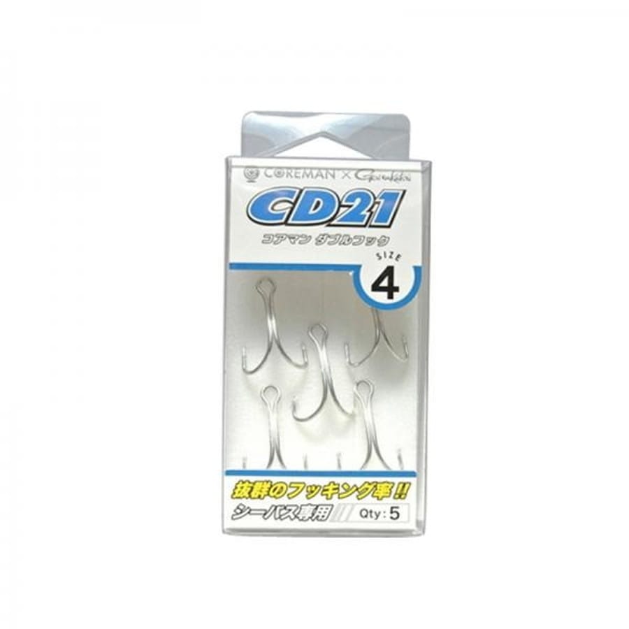 刺さりの良さと輝きの持続を実感できる!コアマン×がまかつのスペシャルフック! ●信頼のがまかつ製フック「ダブル21」に特別表面メッキ処理(金属及び鉛製ルアーに装着の際、電蝕により変色がない錫メッキ)を施して、刺さりの良さと輝きの持続を実感できる、コアマンスペシャルフック。 ●ダブル21のフックの開き角度は80度ですが、これはターゲットの口の中にに入りやすい形状なので、ミスバイトが少ないのが特徴です。 ●またフックポイントが近いので、ひとたびフッキングが決まれば2本共に刺さることが多く、バラシが少ないのも大きなメリットです。 ●グローバルスタンダード的な普遍のデザイン。ワンランク上のワイヤーを採用しており強度的にも申し分ありません。
